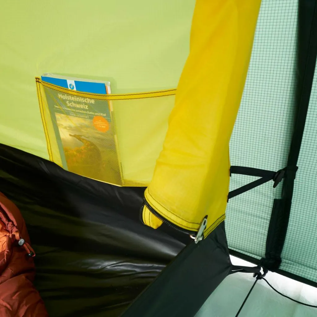 Auch im Innenzelt lässt es sich gut aushalten. Es bietet zwei bis drei (auch großen) Personen ausreichend Platz zum Sitzen und Liegen. Vier Netztaschen verstauen Bücher, Lampen, Smartphone und anderen Kleinkram. Auch praktisch: Deine feuchte Wäsche kannst du auf der im Innenzelt gespannten Wäscheleine zum Trocknen aufhängen.