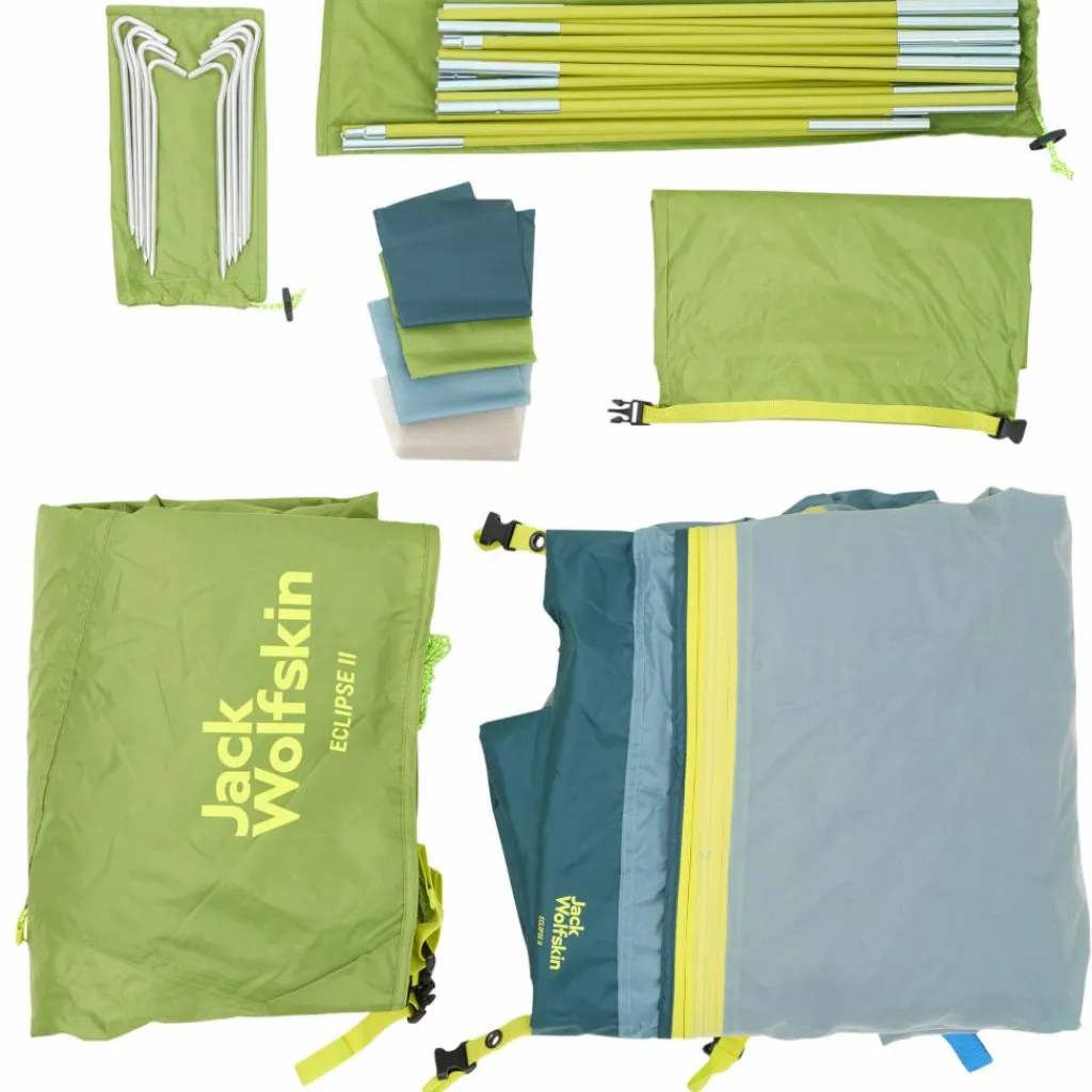 Beim Eclipse II wird auf ein unempfindliches Kunststoffgestänge gesetzt. Durch das erhöhte Gewicht eignet es sich das Zelt weniger für Wanderungen, kann dafür aber auf Radtouren und Paddeltouren punkten. Die bewährte Konstruktion ermöglichst zwei Personen einen bequemen Schlafplatz und genügend Stauraum für Gepäck, das in den Apsiden verstaut werden kann. Die dort eingesetzten Sichtfenster erlauben jederzeit einen Blick nach draußen zu werfen, ohne das Zelt öffnen zu müssen.