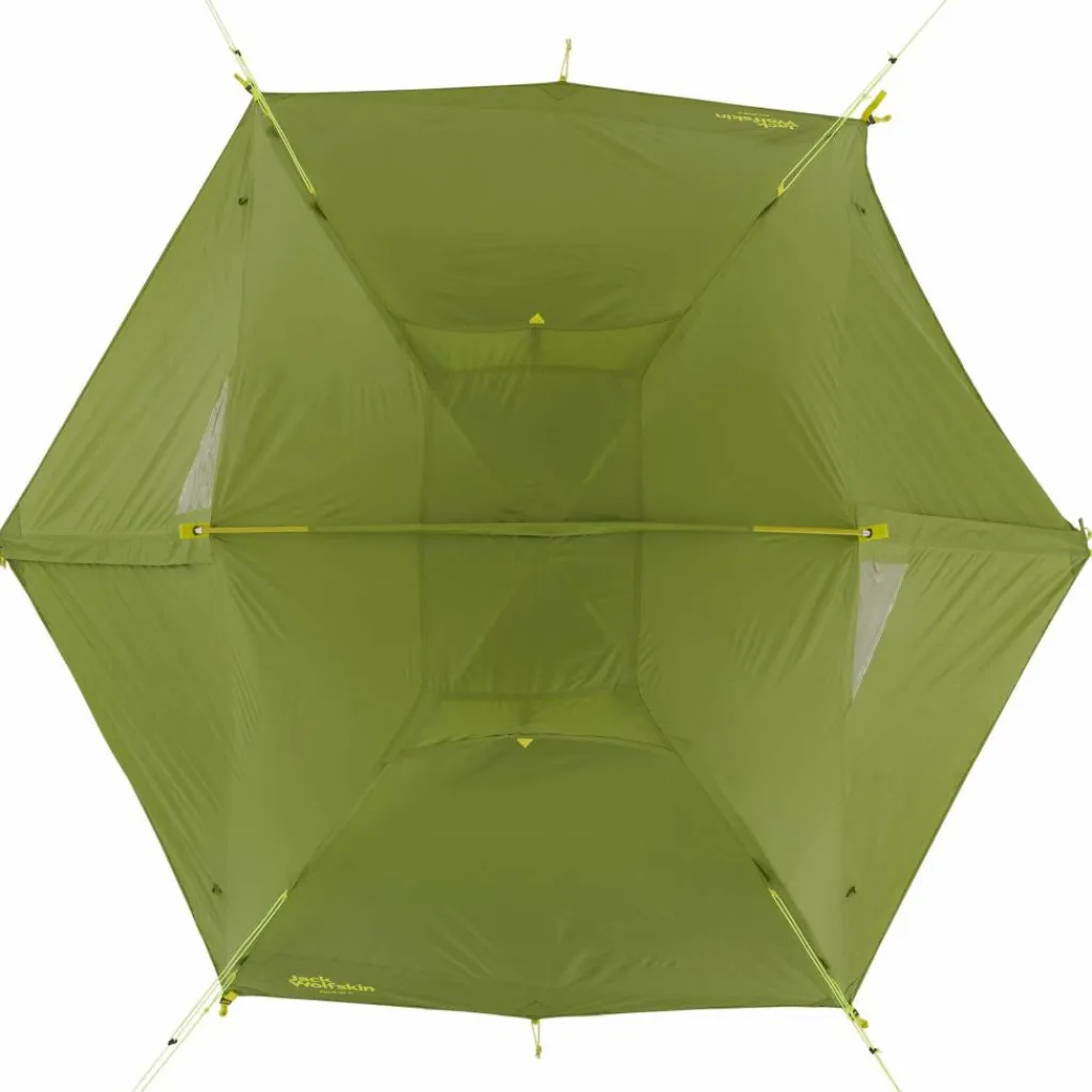 Belüftet wird das Kuppelzelt über die beiden aufstellbaren Hochlüfter, die mit einer Regenschutzleiste versehen sind. So kann der Wind die Regentropfen nicht durch den Lüfter ins Zelt drücken. Ist der Abend besonders mild oder sehr warm, kannst du das Außenzelt auch weglassen und nur das Innenzelt aufstellen. Die großflächigen Meshflächen in den Eingangstüren können dabei für mehr Privatsphäre abgedeckt werden.