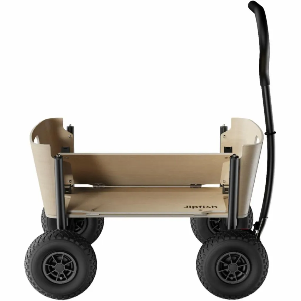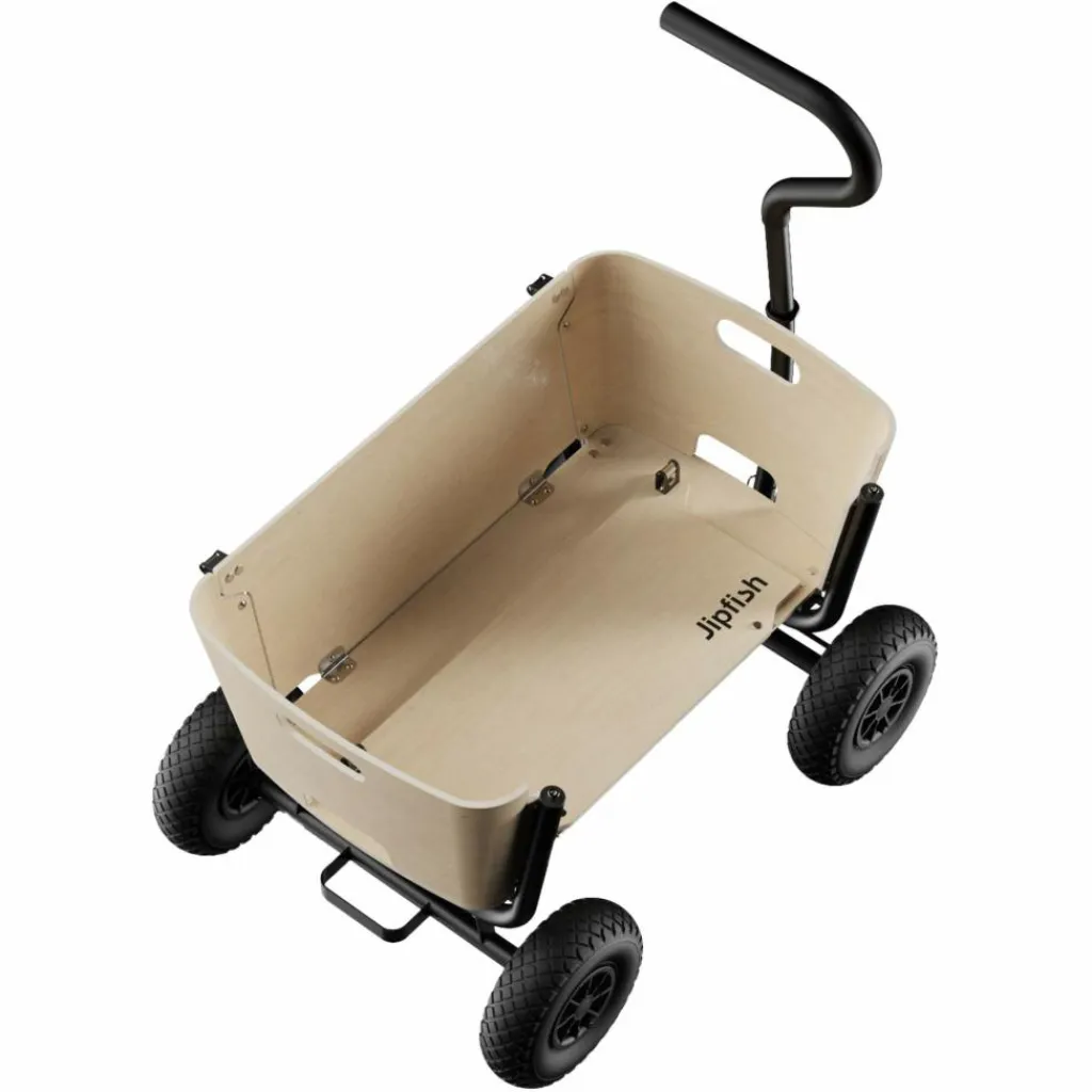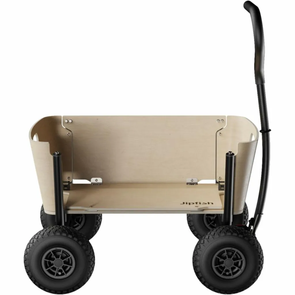 Dank seines kompakten Maßes passt der Jipfish auch in kleine Kofferräume und eignet sich dadurch ideal für spontane Familienausflüge. Der Aufbau ist zudem kinderleicht: Einfach den Wagen hochklappen, die Seitenwände aufrichten und der Bollerwagen ist bereit fürs Abenteuer. Wurden die Reifen abgenommen, lassen sich auch diese mit nur wenigen Handgriffen und ohne Werkzeug befestigen.