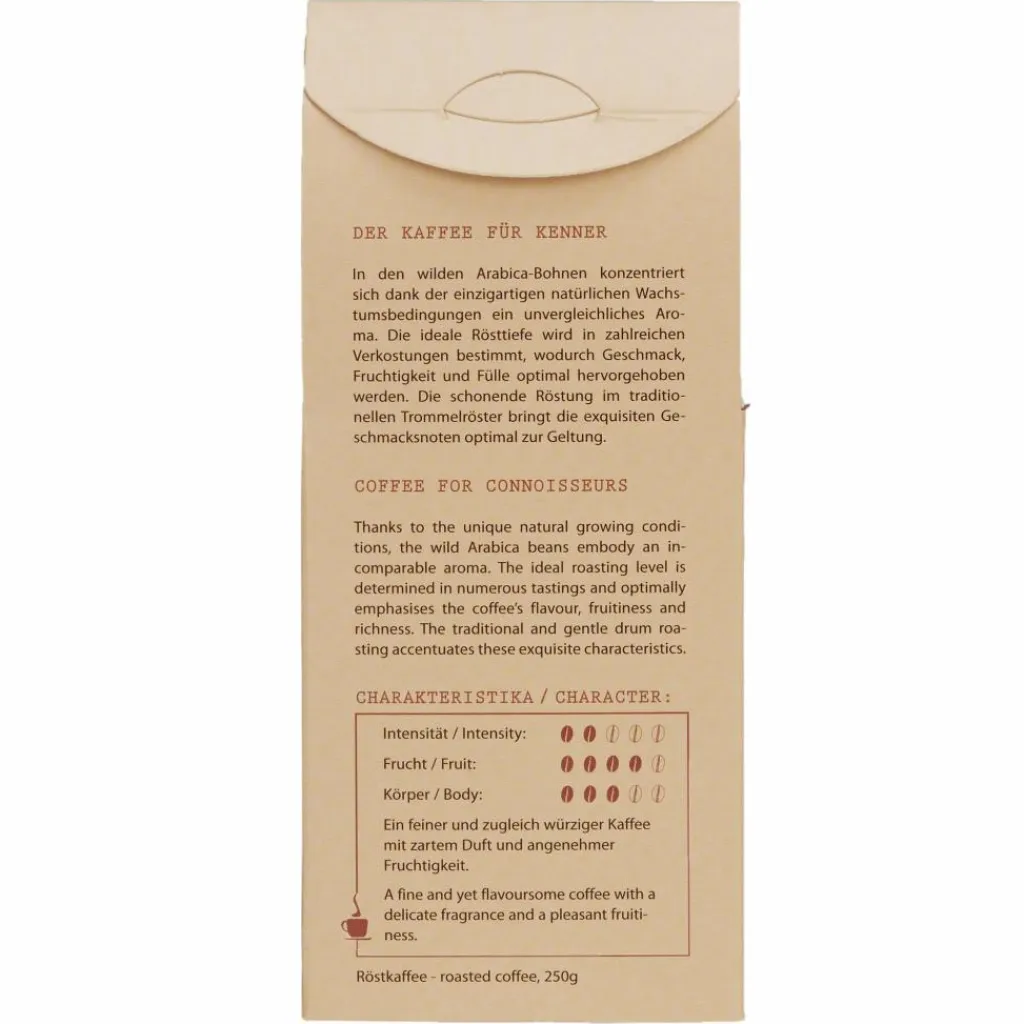 Ein feiner und zugleich würziger Kaffee mit zartem Duft und milder Säure. Cremig-weich, aromatisch und ausgewogen.
