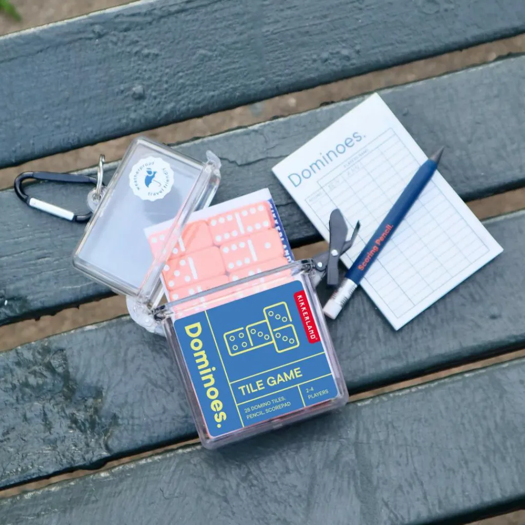 Domino für unterwegs: Ob vorm Zelt oder in der Bahn, mit den Dominoes ist immer eine Partie möglich. Praktisch: Alle Utensilien fürs Spiel kommen in einer wasserdichten Box mit Karabiner.