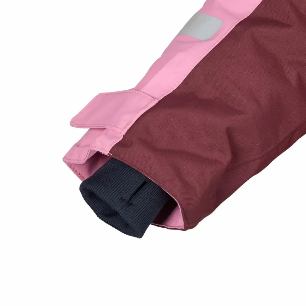 Die Jacke ist mit vielen praktischen Details ausgestattet. So lässt sich die hinten per Klettverschluss einstellbare Kapuze abnehmen. Auch die Ärmelbündchen sind mit Klett versehen. Um es Kälte noch schwerer zu machen, sind sie mit integrierten Stulpen ausgestattet, die dank Daumenschlaufen nicht rutschen. Damit die Handschuhe deiner Kids nicht verloren gehen, können diese an Schlaufen befestigt werden. Für schummrige Lichtverhältnisse ist die Winterjacke mit reflektierenden Designelementen ausgerüstet. Zusätzlich lässt sich an der dafür vorgesehenen Schlaufe in einer RV-Tasche ein Reflektor anbringen.