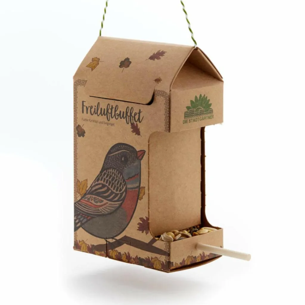 Die Futterstelle aus Naturkarton ist unkompliziert in der Befüllung und Aufhängung. Auf der stabilen Sitzstange aus Holz können deine gefiederten Freunde bequem Platz nehmen und sich nach Herzenslust bedienen. Die Futterstation enthält eine Schnur zur Aufhängung, 200 Gramm leckeres Futter und eine Sitzstange.