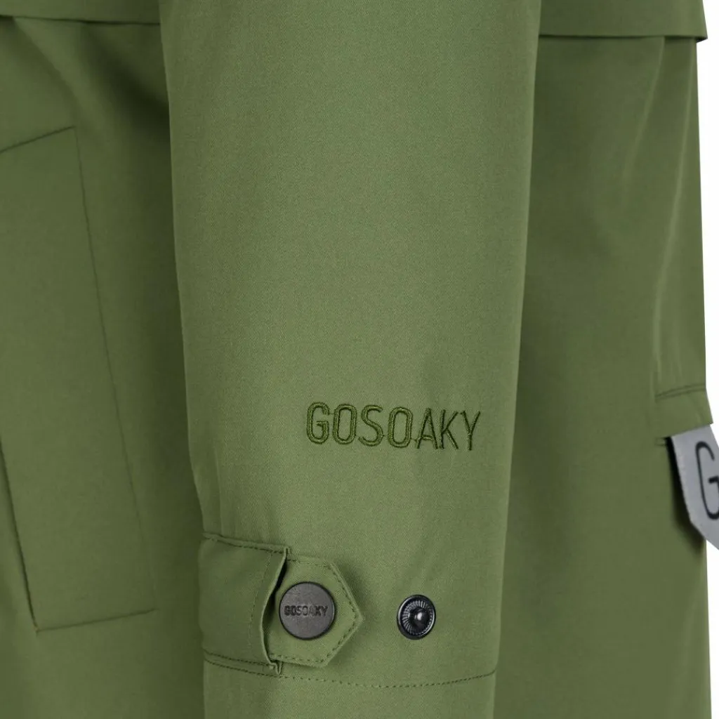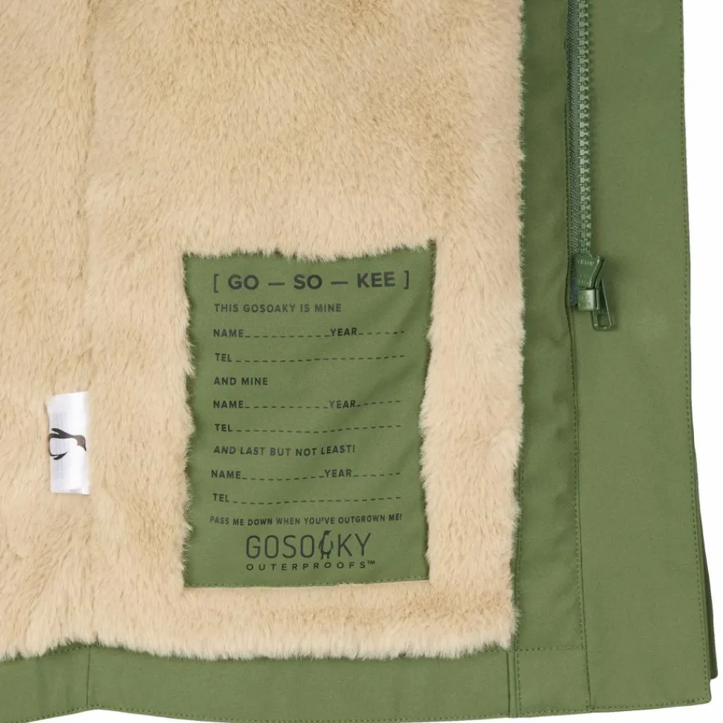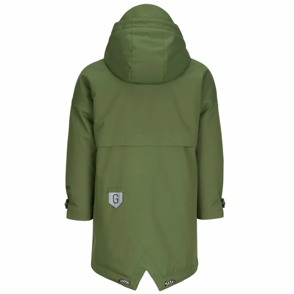 Durch die bequeme Passform und den v-förmigen Bewegungsschlitz hinten engt die Jacke trotz des langen Schnitts beim Toben nicht ein. Am Rücken befindet sich eine kleine Tasche mit einem reflektierenden Gosoaky-Schild. Bei schlechter Sicht kann das Schild hervorgeholt werden, ansonsten kann es auch einfach in der kleinen Tasche versteckt werden. Die Windschutzleiste, die abgedeckten Fronttaschen und die Ärmelbündchen mit Druckknopfverschluss verleihen der Jacke eine besonders schicke Optik. So kann sie sich nicht nur beim Toben auf dem Schulhof oder auf dem Spielplatz, sondern auch bei der nächsten Familienfeier sehen lassen.