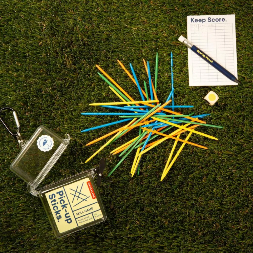 Nimm dieses klassische Geschicklichkeitsspiel mit auf deine Reise! Enthält 41 Stöcke, 2 Würfel, 1 wasserfestes Spielfeld, 1 Bleistift und eine Anleitung – alles verpackt in einem wetterfesten Koffer mit Schlüsselkarabiner, der sich an jeder Tasche oder jedem Gurt befestigen lässt. Perfekt für Reisen, Camping und Outdoor-Spaß.