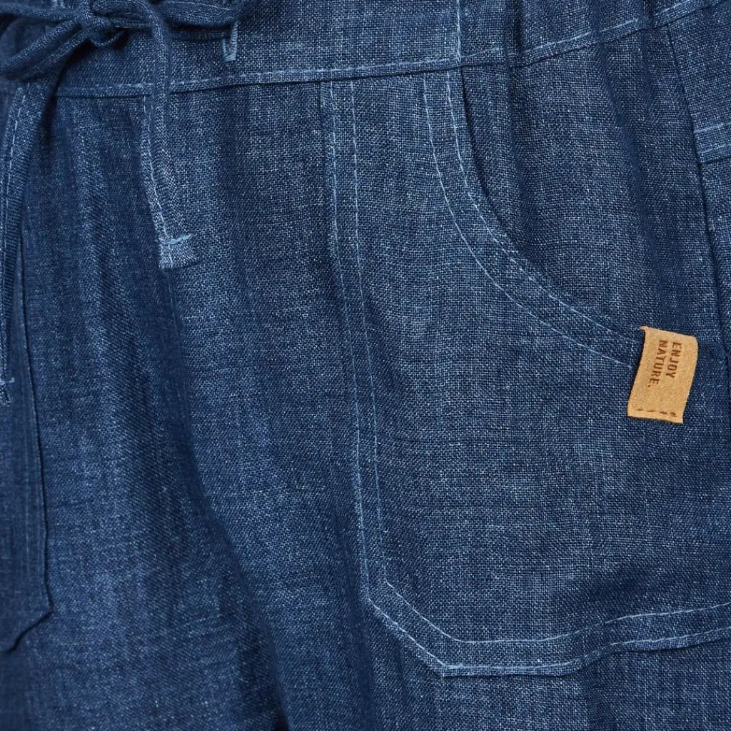 Dank des elastischen Hosenbunds sitzt die Leinenhose sehr bequem. Der Schnürzug im Bund lässt sich passgenau auf die richtige Weite einstellen. Die Beinabschlüsse umgeschlagen und per Lasche und Knopf fixiert werden. So gelangt bei sommerlichem Wetter mehr Luft an die Beine. In den beiden aufgesetzten Taschen können die kleinen Sachensucher ihre Fundstücke verstauen.