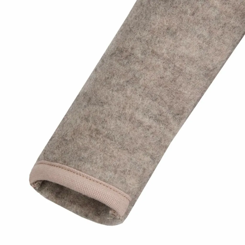 Der Wollfleece-Anzug ist aus reiner Bio-Merinowolle gefertigt, ist flauschig weich und hält angenehm warm. Merinowolle wirkt auf natürliche Weise feuchtigkeitsleitend und temperaturausgleichend. Dank dieser Eigenschaften sorgt das Material jederzeit für ein angenehmes Körperklima, egal ob die Kleinen gerade durch das Herbstlaub rennen oder sich entspannt von den Eltern durch die Natur tragen lassen. Zudem wärmt Wolle auch im feuchten Zustand, so braucht im Falle eines kleinen Nieselregens nicht gleich zur Regenbekleidung gewechselt zu werden. In den beiden Einschubtaschen können glänzende Kastanien und andere liebgewonnene Fundstücke zwischengelagert werden.