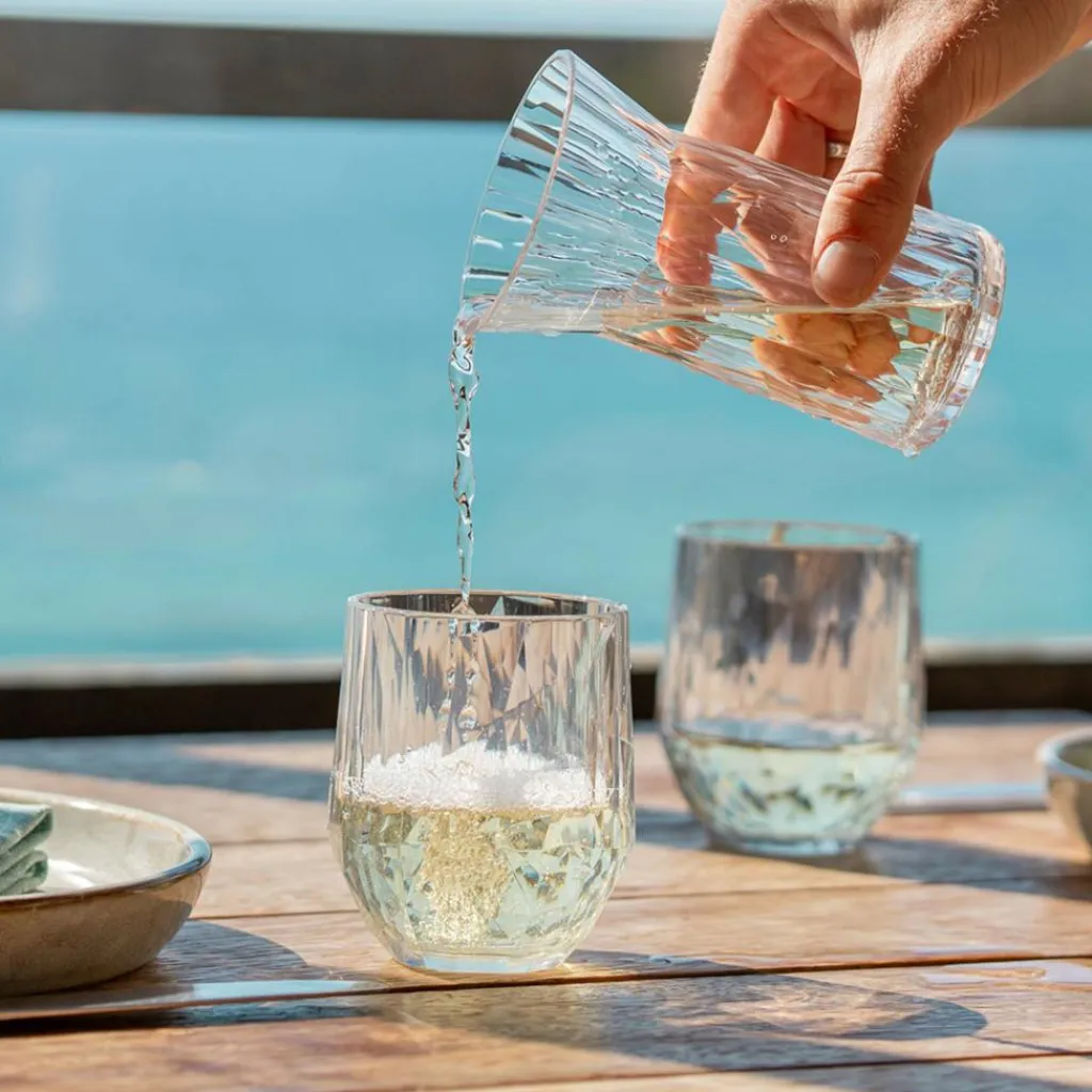 Durch das schöne Facettendesign sind die 200 ml großen Weingläser ein echter Hingucker auf jedem gedeckten Tisch. Das Superglas-Material sorgt dafür, dass die Trinkgläser auch bei häufiger Nutzung ihr Aussehen behalten. Es handelt sich um eine Eigenentwicklung von Koziol, die aus recycelten Sonnenblumen- und Rapsölen hergestellt wurde. Das Material zeichnet sich durch hohe Robustheit und eine leicht isolierende Wirkung aus, sodass der Weißwein länger temperiert bleibt als in herkömmlichen Weingläsern.