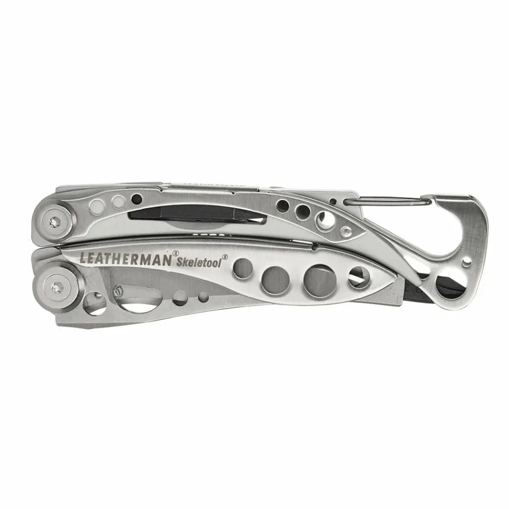 Die durchbrochenen Griffe aus Edelstahl nehmen beim Skeletool die Technik auf. Leichte Griffschalen aus 6061-T6 Aluminium geben der Hand den nötigen Halt. Die Spitzzange verfügt über einen Draht- und Hartdrahtschneider, die Klinge (mit partiellem Wellenschliff) aus 420HC-Stahl kann einhändig geöffnet werden.