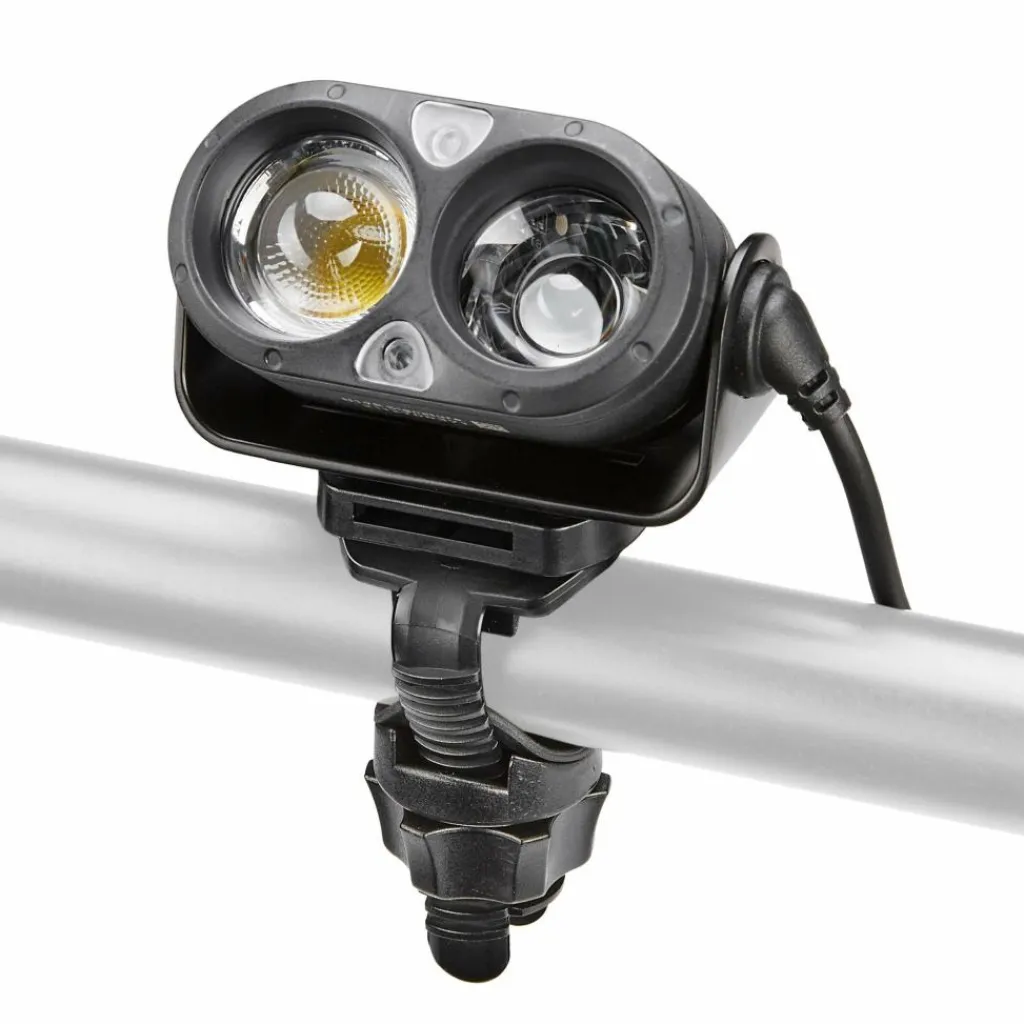 Der Lampenkopf aus Aluminium fasst drei LEDs. Eine rote LED, die die Nachtsichtigkeit erhält und zwei weiße LEDs. Die Reflektoren der weißen LEDs eignen sich zur Nah- und Fernausleuchtung und können einzeln oder kombiniert betrieben werden. Die zuschaltbare automatische Helligkeitsanpassung schont den Akku und das Auge. Es dimmt das Licht, sobald nahe gelegene Gegenstände angeleuchtet werden und regelt es wieder hoch, wenn du in die Ferne blickst.