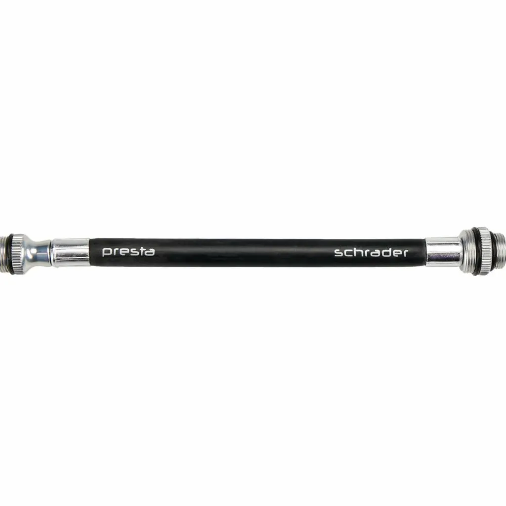 Zum Transport wird der Schlauch platzsparend im Pumpenkörper verstaut und ist somit schnell zur Hand. Die Anschlüsse passen auf Dunlop (klassisches Fahrradventil), Presta (französisches Ventil/Sclaverandventil) und Schrader Ventile (Autoventil).