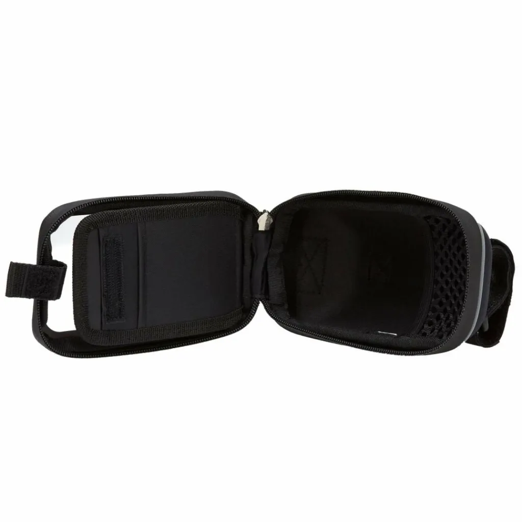 Durch die klare Folie auf der Oberseite kannst du dein Smartphone jederzeit bedienen. Es passen Modelle mit einem 4 bis 5 Zoll großem Display hinein, das von der Hinterseite durch eine Klappe mit Klettverschluss vor dem Verrutschen gesichert wird. Im Innern der Tasche befindet sich eine EC-Kartentasche und Platz für weitere Utensilien. So kannst du z. B. auch eine Powerbank, Ladekabel, Energieriegel oder ein Portmonee mitnehmen.