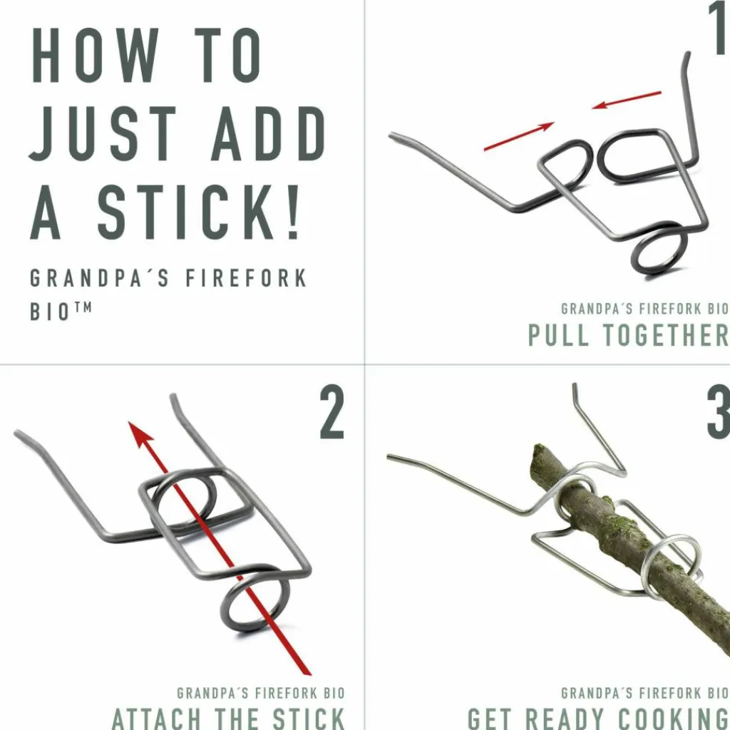 GrandPa’s FireGrill ist ein klappbarer Grillrost, der in seiner Mitte Würstchen, Fleisch oder Gemüse sicher und verlustfrei festhält. Mithilfe eines Stocks kannst du den Grillrost über die Glut halten. Geht es größeren Würstchen, Maiskolben oder Marshmallows an den Kragen, greifst du zu GrandPa’s FireFork Bio. Die Gabel wird ebenfalls an einem Stock befestigt und richtet dank ihrer Schutzkappe im Gepäck keinen Schaden an. Damit das Feuer überhaupt anfängt zu brennen, befindet sich ein Tinder-on-a-Rope (Fatwood) und ein Swedish FireSteel scout Bio (Feuerstarter) im Paket. Damit kannst du bei jeder Witterung ein Feuer entfachen.