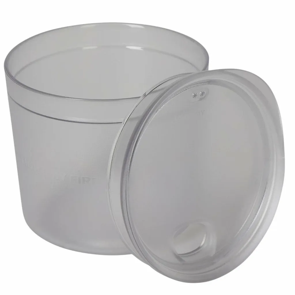 Dieser leichte Kunststoffbecher überzeugt mit einem schlichten, praktischen Design. Er ist durchsichtig und lässt sich stapeln. Der Deckel schützt das Getränk vor Insekten und erleichtert das Trinken.