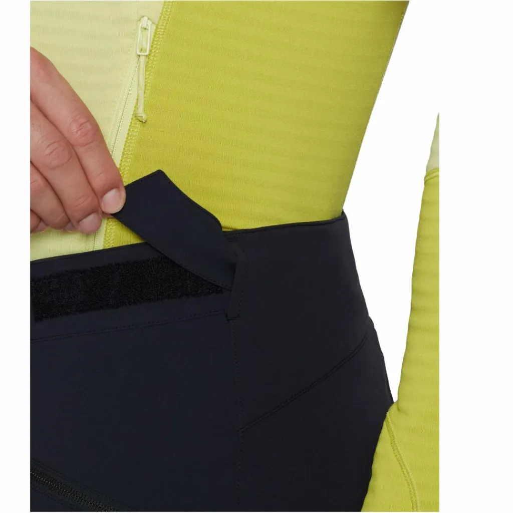 Der breite, flache Bund sitzt auch unter einem Becken- oder Klettergurt sehr angenehm und lässt sich von außen passgenau einstellen. An dem Stiefelhaken kannst du die Schnürsenkel deiner Bergschuhe befestigen. Benötigst du ihn nicht, kannst du ihn einfach verstauen, damit er nicht im Weg ist. Die Beinabschlüsse lassen sich per Druckknopf enger stellen, damit du beim Klettern deine Füße besser sehen kannst. So eignet sich die Courmayeur SO Pants Men perfekt für alpine Klettertouren, aber auch für herausfordernde Wander- und Trekkingtouren ist sie prima einsetzbar.
