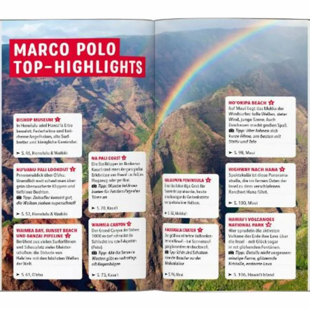 Braun gebrannte Surfer, Schirmchendrinks und Palmenstrände – Hawaii ist Kult. Die Inseln des 50. US-Bundesstaats gelten nicht umsonst als Urlaubsparadies: Der MARCO POLO Reiseführer Hawaii führt dich an die schönsten Strände und einsame Wasserfälle im Hinterland und macht Lust auf die authentische hawaiianische Küche bei einem „Luau“. MARCO POLO Best of Tipps für Regenwetter, Low Budget und den Urlaub mit Kindern