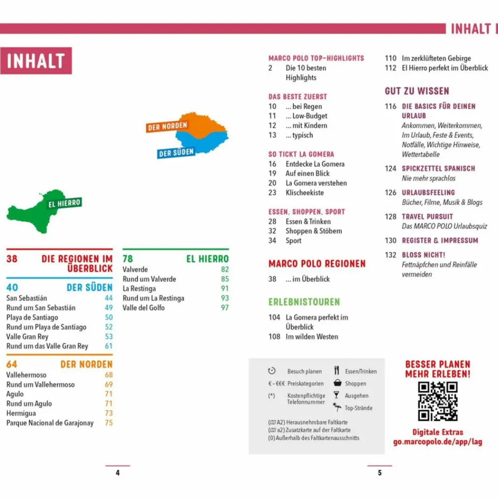Mit deinem MARCO POLO Reiseführer La Gomera & El Hierro hast du stets den Überblick und verpasst keines der Highlights! Entdecke, was die Einheimischen an ihrer Insel lieben mit den MARCO POLO Insider-Tipps Wo Europa zu Ende ist: Erkunde fantastische Inselwelten mit den MARCO POLO Erlebnistouren und der kostenlosen Touren-App Shoppen & Stöbern, Essen & Trinken, Ausgehen & Feiern: Mach genau das, worauf du Lust hast! Best-of-Tipps für Regenwetter, Low-Budget und Urlaub mit Kindern Smarter reisen mit komplett überarbeitetem Kartenmaterial und Stadtplänen.