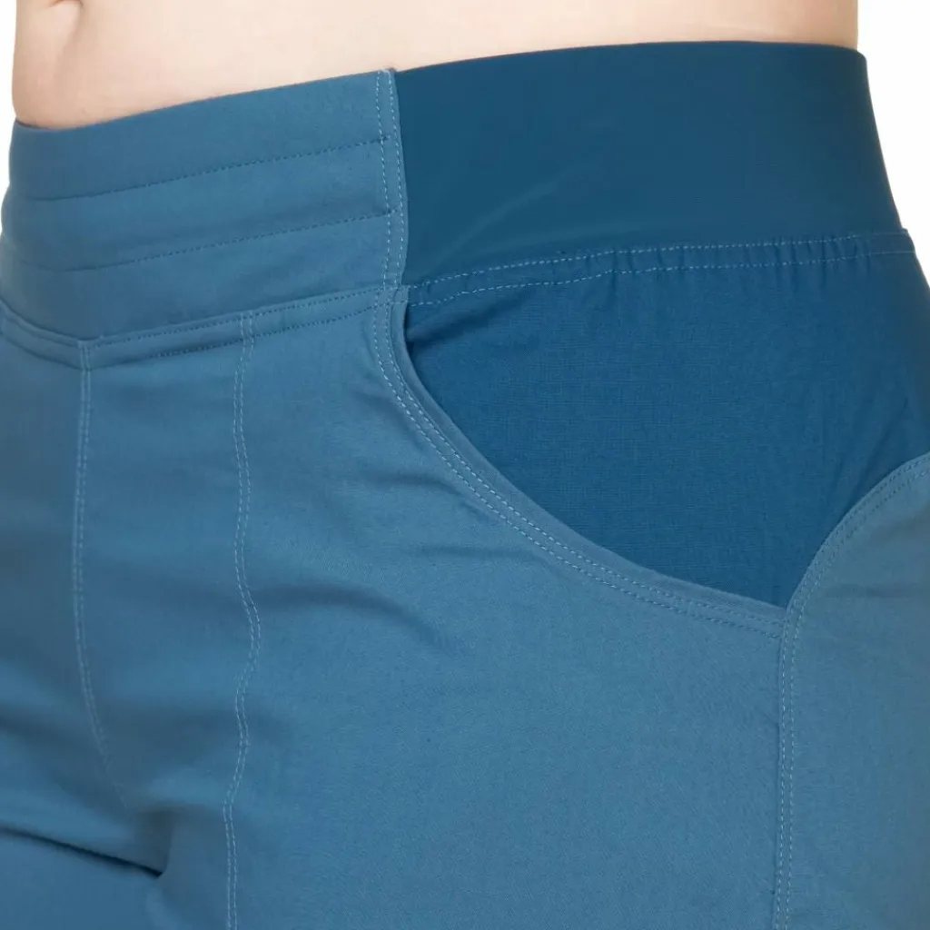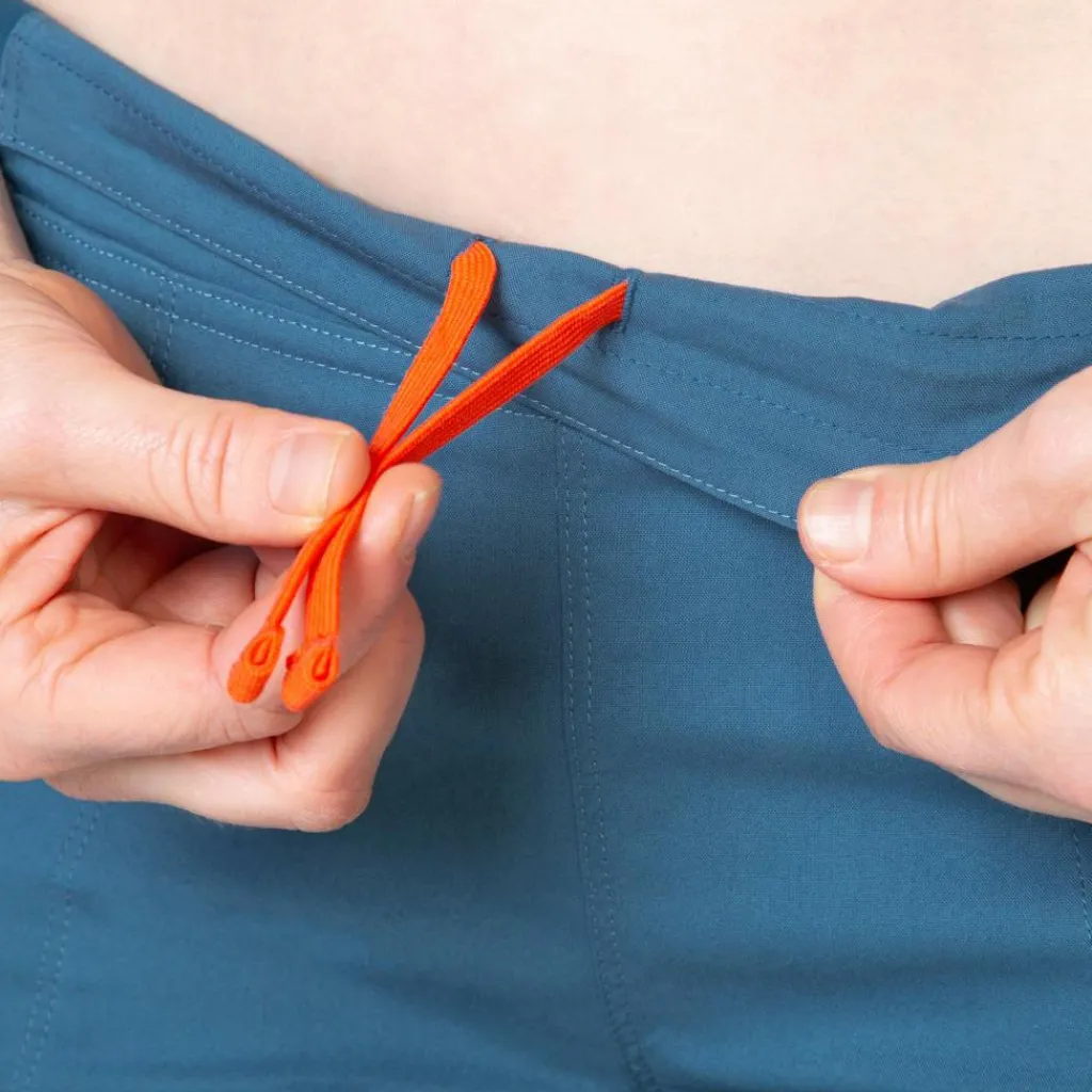 Die Shorts hat einen breiten, flachen Stretch-Bund, der gut unter den Klettergurt passt. Ein Schnürzug auf der Innenseite des Bundes ermöglicht es dir, die Weite individuell einzustellen. Zwei Gesäßtaschen und zwei Einschubtaschen bieten Platz für nützliche Kleinigkeiten.