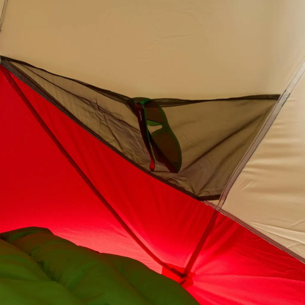 Das Innenzelt bietet dank des Querbogens viel Platz und eine Innenhöhe von 97 cm, was das Sitzen erleichtert. Die A-förmigen Gestängeenden sorgen für steile Zeltwände im Fuß- und Kopfbereich, wodurch vier Netztaschen für eine bessere Organisation zur Verfügung stehen. Zwei Seitentaschen und zwei Deckentaschen bieten Platz für Ausrüstungsgegenstände, während in der Zeltdecke mehrere gespannte Wäscheleinen das Trocknen feuchter Kleidung ermöglichen.