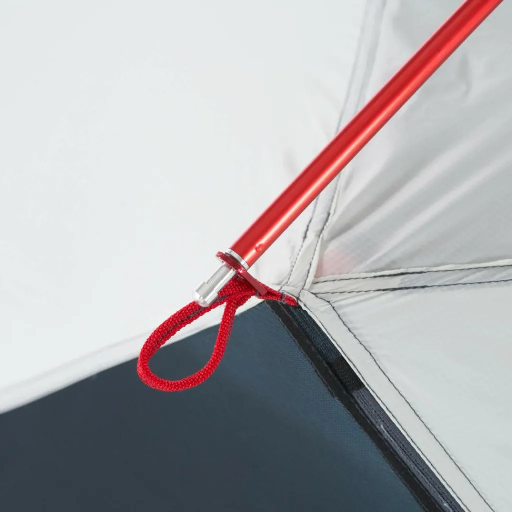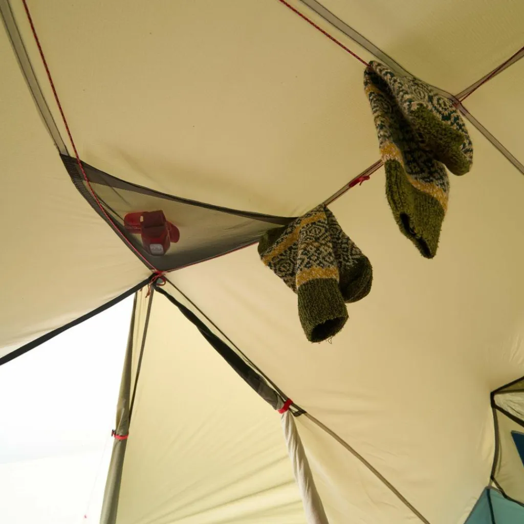 Im Innenraum stehen dir vier Schlaufen zur Verfügung, etwa zum Aufhängen einer Zeltlaterne. Im Deckenbereich befindet sich eine Wäscheleine, auf der du Kleidung zum Lüften oder trocknen hängen kannst. Ergänzt wird das Stauraumangebot durch mehrere Netztaschen. Zwei kleinere befinden sich im Deckenbereich, vier große im Kopf- und Fußbereich. So bringst deine Ausrüstung übersichtlich unter.