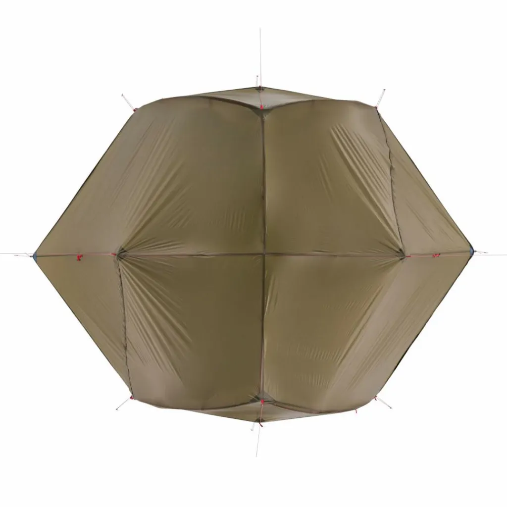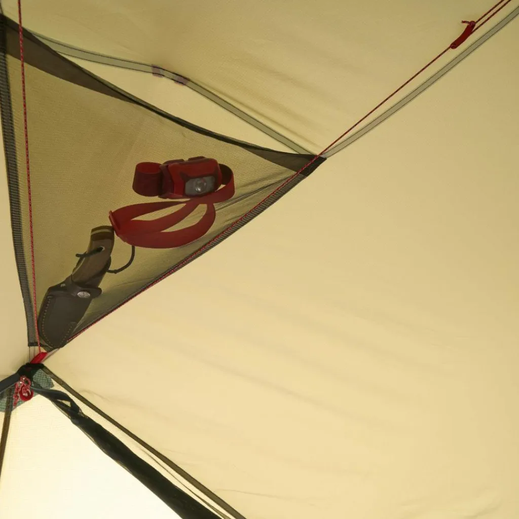 Im Innenraum stehen dir vier Schlaufen zur Verfügung, etwa zum Aufhängen einer Zeltlaterne. Im Deckenbereich befindet sich eine Wäscheleine, auf der du Kleidung zum Lüften oder trocknen hängen kannst. Ergänzt wird das Stauraumangebot durch mehrere Netztaschen. Zwei kleinere befinden sich im Deckenbereich, vier große im Kopf- und Fußbereich. So bringst deine Ausrüstung übersichtlich unter.