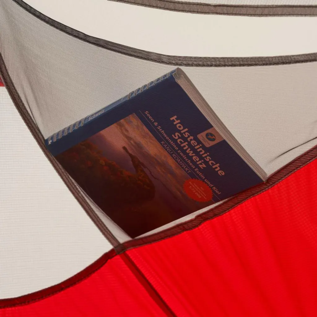 Den Eingangsbereich kannst du zur Hälfte oder komplett öffnen, was dir das Einräumen und Zusammenpacken deiner Ausrüstung erleichtert bzw. einen Panoramablick aus dem Zelt ermöglicht. Die Apsis verstaut deinen Rucksack oder andere Ausrüstung. Um sie aufzuspannen genügt lediglich ein Hering.