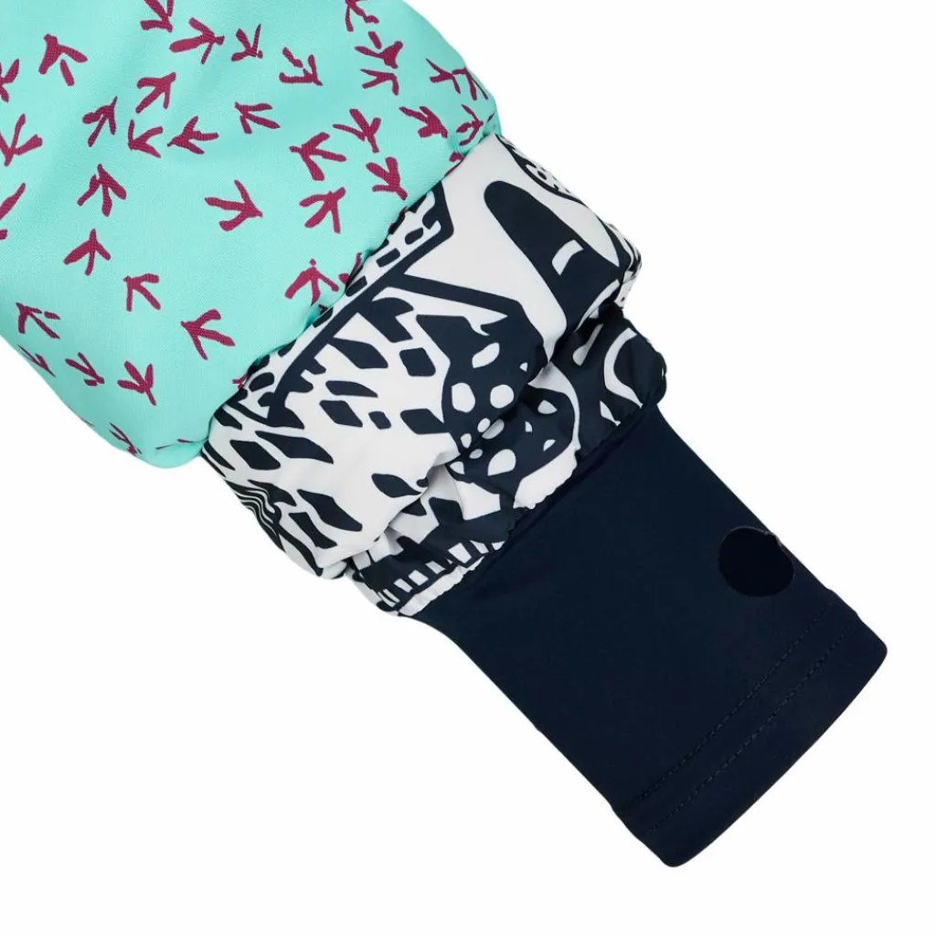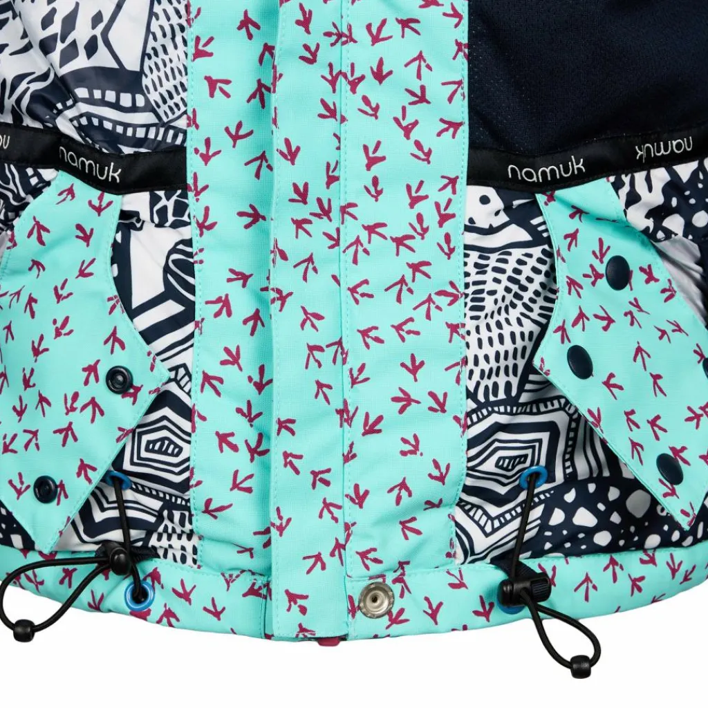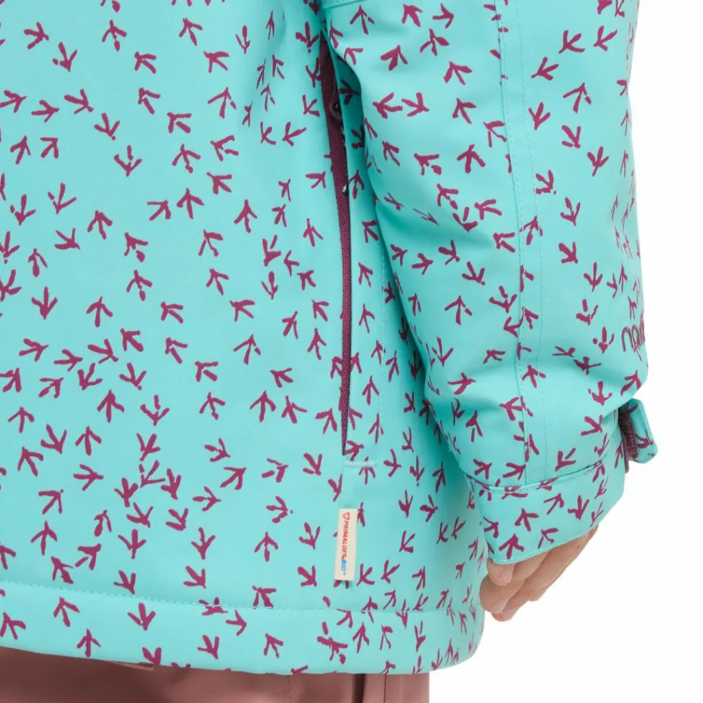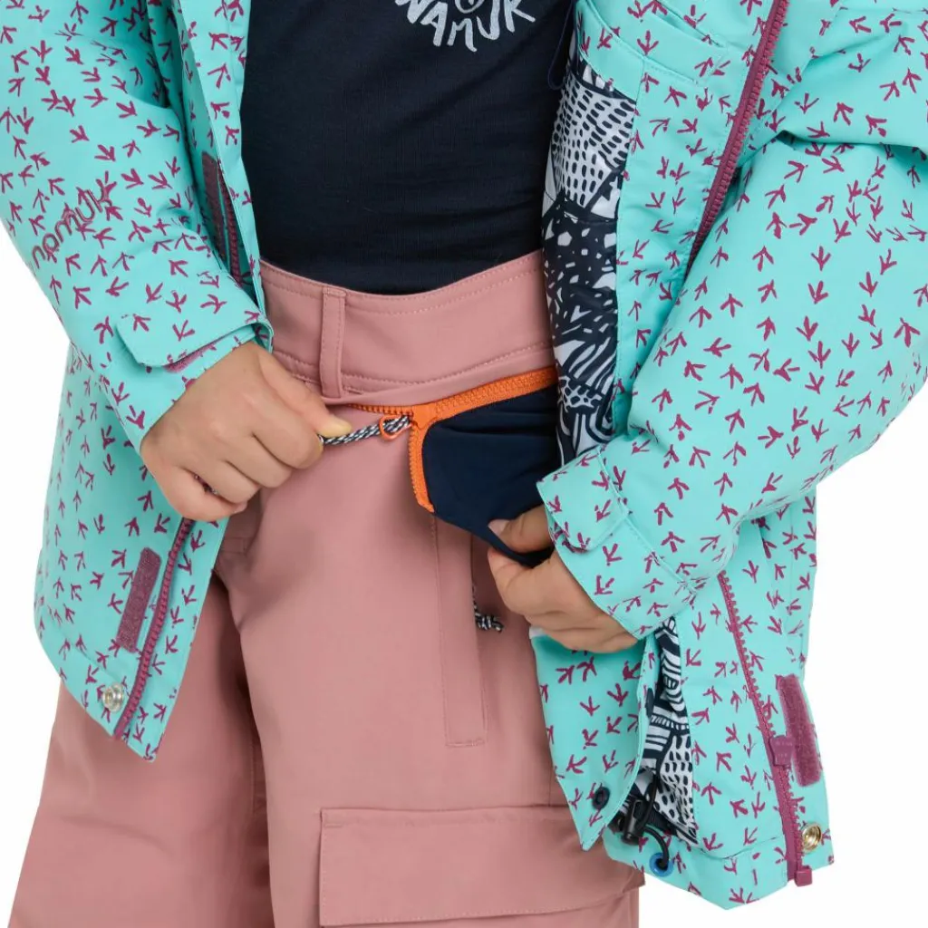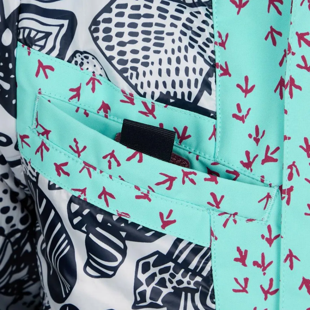 Für noch mehr Schutz vor Nässe und Kälte ist die Jacke mit einer gut sitzenden, verstellbaren Kapuze ausgestattet. Ein integrierter Schnee- und Windfang verhindert, dass aufgewirbelter Schnee an den Rücken gelangt. Die Ärmelbüdchen verfügen über einen Klettverschluss zur Weitenregulierung elastische Stulpen, die ebenfalls den Wind draußen lassen. Fünf Taschen, darunter eine Skipasstasche am Ärmel und eine Netz-Innentasche für Mützen & Co. bieten viel Stauraum. Dank des glatten, weichen Taftfutters rutscht die Jacke problemlos über jeden Midlayer. Perfekt, wenn die Lütten schnell raus in den Schnee stürzen wollen.