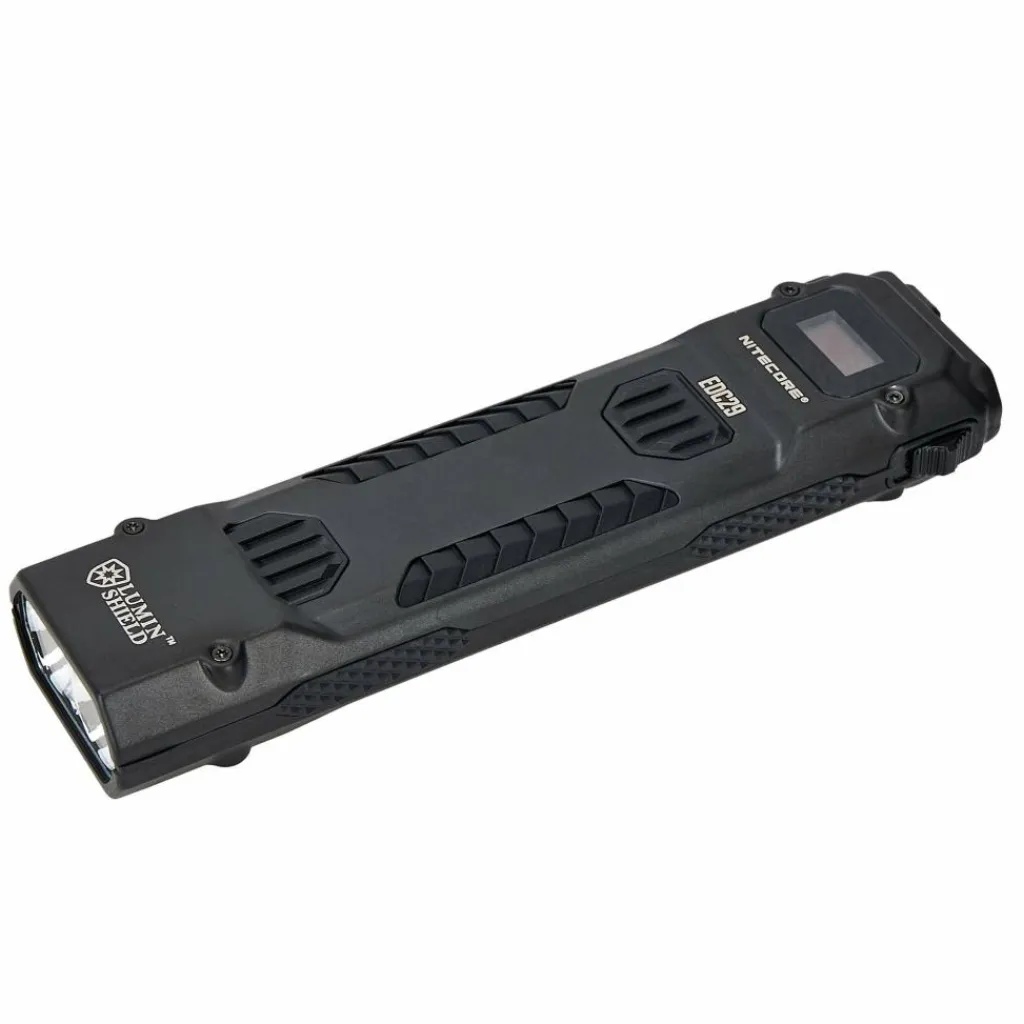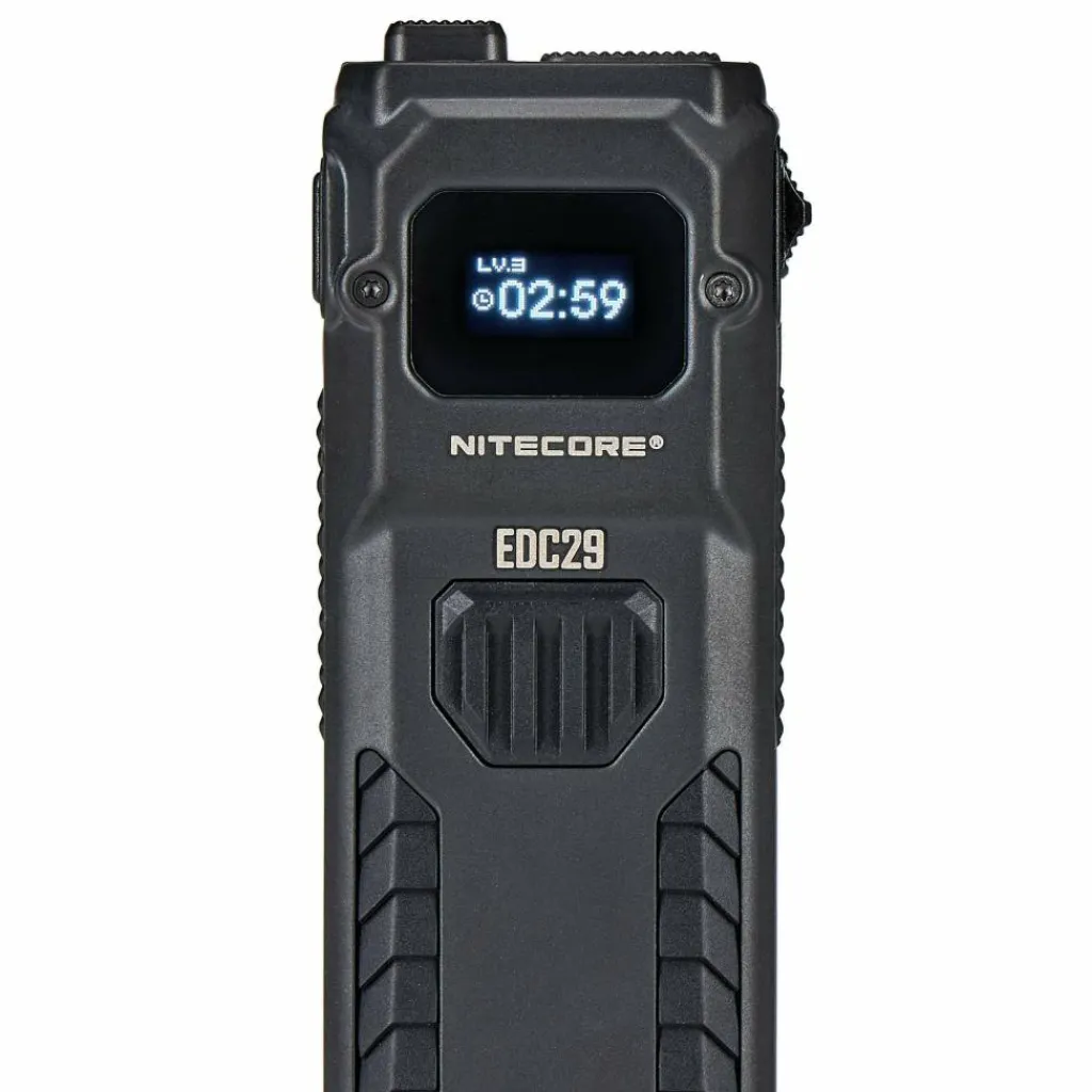 Die EDC29 verfügt über einen abnehmbaren Hosenclip, mit dem du die Lampe sicher in der Hosentasche oder am Rucksack befestigen kannst. Das hochfeste Gehäuse besteht aus Edelstahl, ist mit einer kratzresistenten PVD-Beschichtung aus Titan versehen und von einem robusten Polymerrahmen eingefasst. Dadurch hält die Lampe selbst starkem Druck problemlos stand.