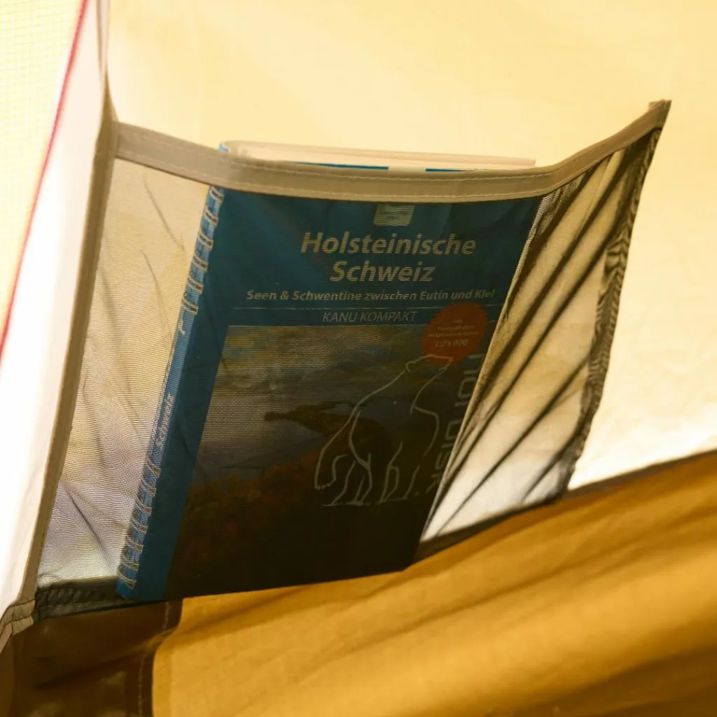 Das Zelt bietet einen guten Wetterschutz für dich und deine Ausrüstung. Fuß- und Kopfbereich des Innenzelts laufen spitz zu. Dort kannst du Ausrüstungsgegenstände wie deine Bekleidung oder Packbeutel verstauen. In der Apsis finden Schuhe und Kochutensilien einen Platz. In den drei Mesh-Seitentaschen und der Deckentasche im Zeltinnern, kannst du hingegen schnell erreichbare Kleinteile verstauen. Zwei Haken, jeweils einer im Kopf und Fußbereich, ermöglichen das Aufhängen einer Wäscheleine zum Trocknen feuchter Kleidung oder das Befestigen einer Zeltlaterne.