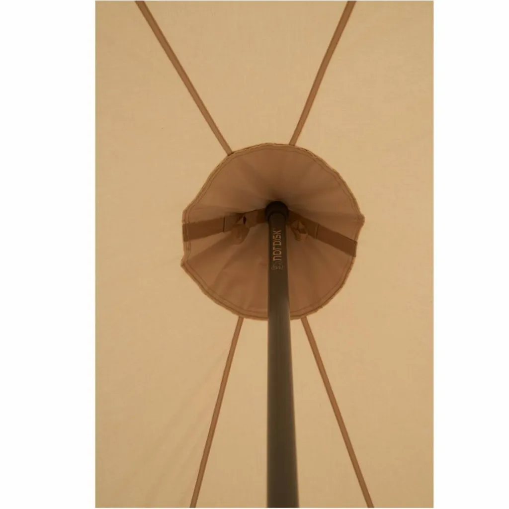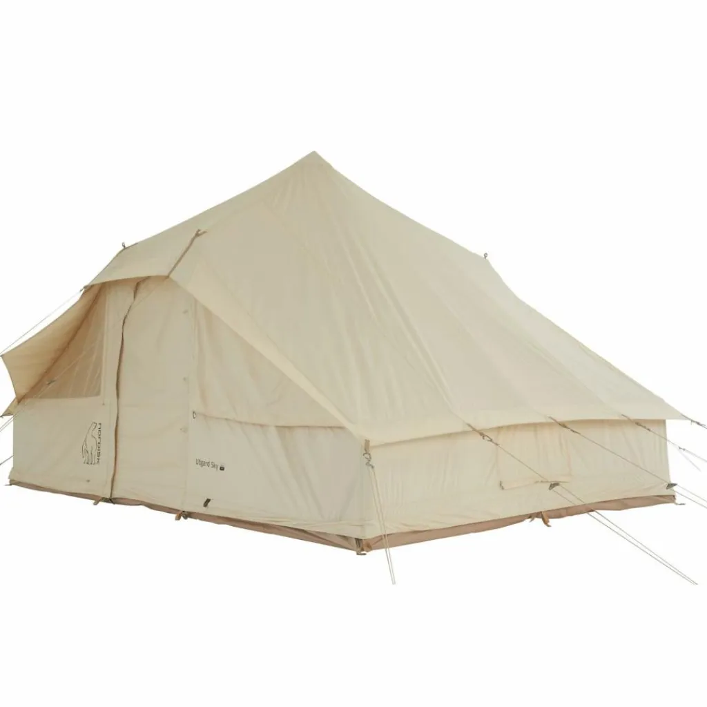 Das Utgard Sky wird mit 5 Stahlstangen aufgebaut, von der eine die Mittelstange bildet. Dank der quadratischen Grundfläche lässt sich der Innenraum unkompliziert einrichten und bietet 6 schlafenden Personen bequem Platz. So finden auch ein kleiner Campingtisch mit kompakten Stühlen darin Platz, genau wie Decken, Teppiche oder Laternen – alles, was du zum Verwirklichen deines Glamping-Traums brauchst. Beim Material sowie bei der Verarbeitung der Befestigungspunkte überzeugt das Zelt mit hochwertiger Qualität und viel Stabilität.