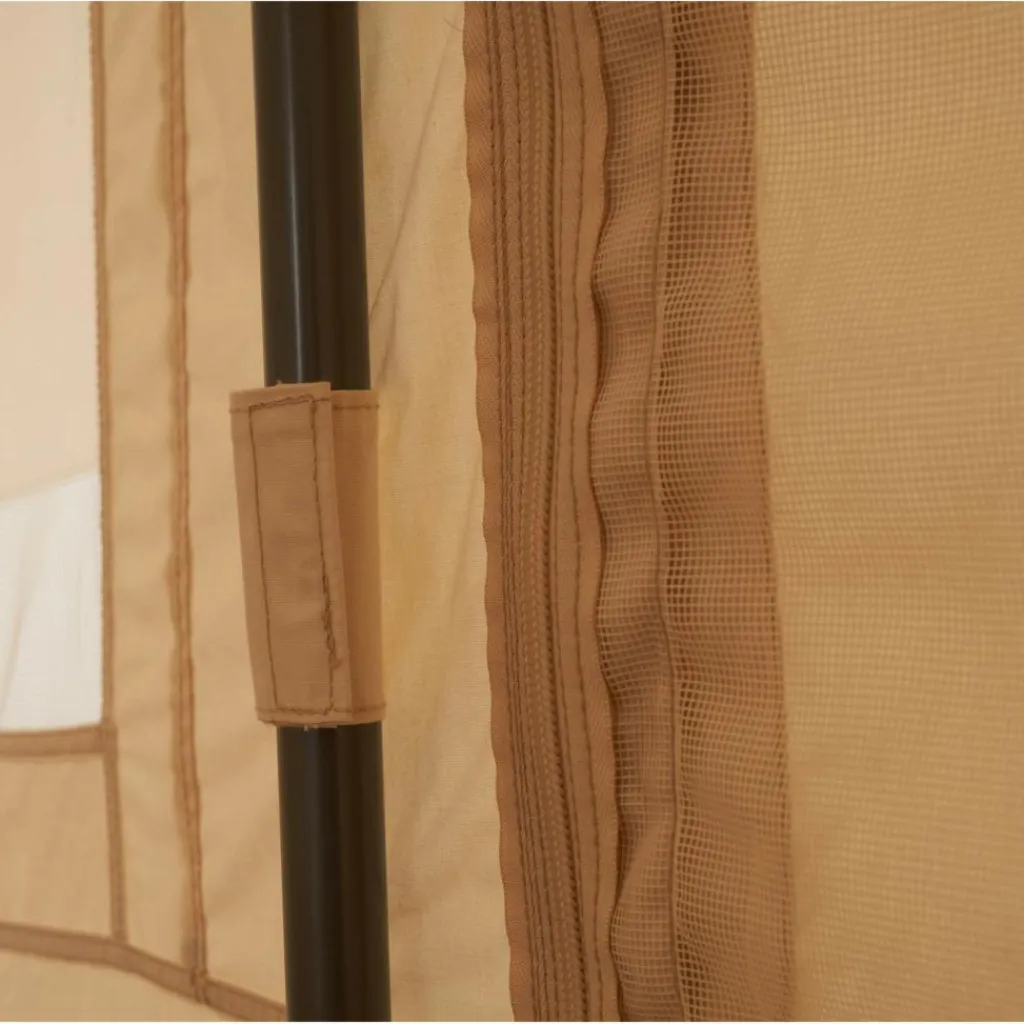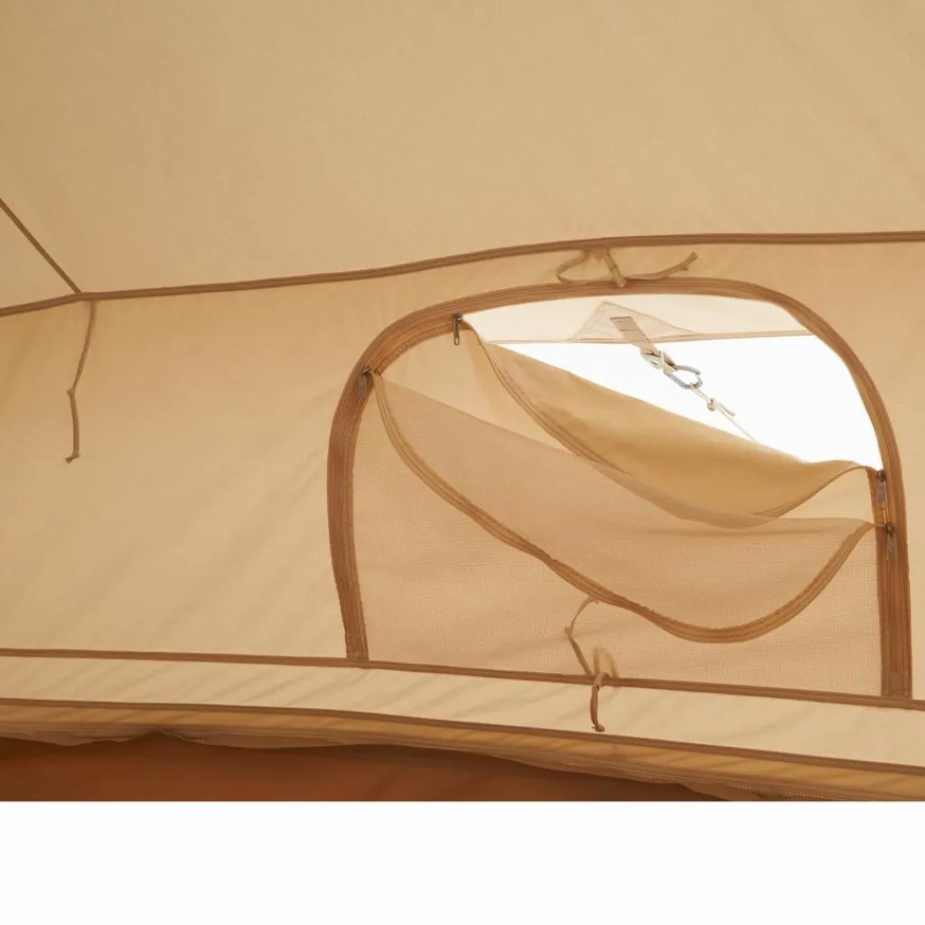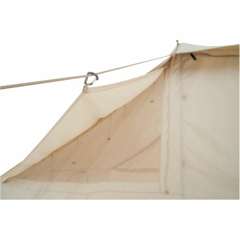 Doch auch im komplett geschlossenen Zustand bietet es dank des Baumwoll-Mischgewebes ein angenehmes Raumklima, da dieses atmungsaktive und kühlende Eigenschaften mitbringt. Gleichzeitig quillt das Gewebe im Kontakt mit Nässe auf und wird so wasserdicht. Auch dank der Fenster sowie der beiden Eingänge, die du alle jeweils mit Moskitogaze verschließen kannst, ist eine hervorragende Belüftung garantiert. Und das, ohne dass Plagegeister eindringen können.