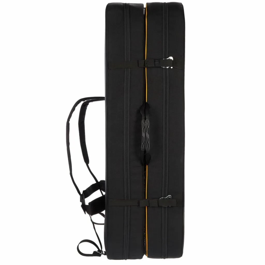 Zum Transport wird die große Bouldermatte einmal in der Mitte zusammengeklappt und mit Hakenschnallen aus Aluminium fixiert. Zwei Klettriemen verhindern ein ungewolltes Aufklappen. Gepolsterte Schulter- und Hüftgurte machen den Weg zum nächsten Boulder bequemer.