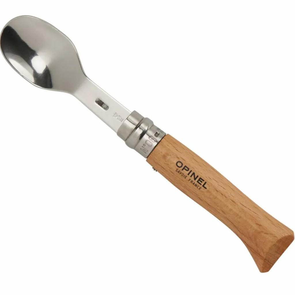 Mit dieser Erweiterung für ein Opinel-Messer der Größe 08 (separat erhältlich) wird der Anwendungsbereich des Messers grundlegend erweitert. In Zusammenarbeit mit dem Designer Franck Fontana wurden ein Löffel und eine Gabel entwickelt, die sich im Griff des Messers befestigen lassen. Hierzu wird die Messerklinge eingeklappt und das Besteckteil in den Spalt am Ende des Griffs gesteckt. Durch den Lockring wird der Einsatz anschließend fixiert und in Position gehalten.