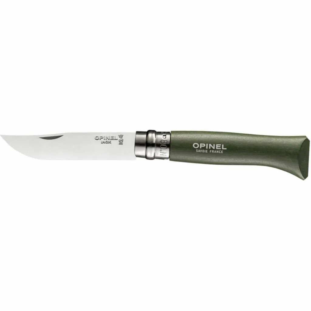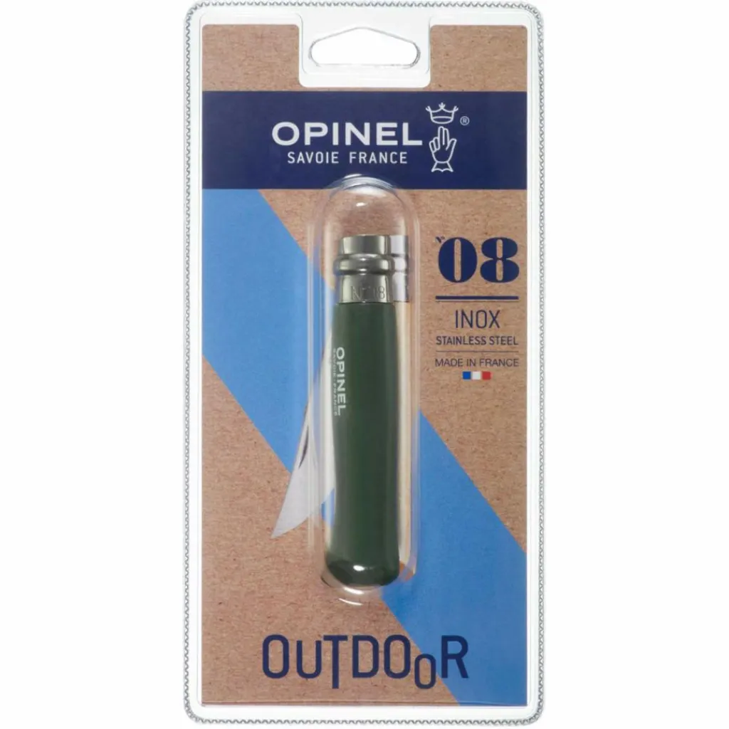 Das Opinel Klappmesser mit dunkelgrünem Griff ist nicht nur optisch für draußen gemacht: die solide Klinge aus rostfreiem Stahl erledigt zuverlässig Arbeiten mit Holz, in der Küche oder beim Angeln.