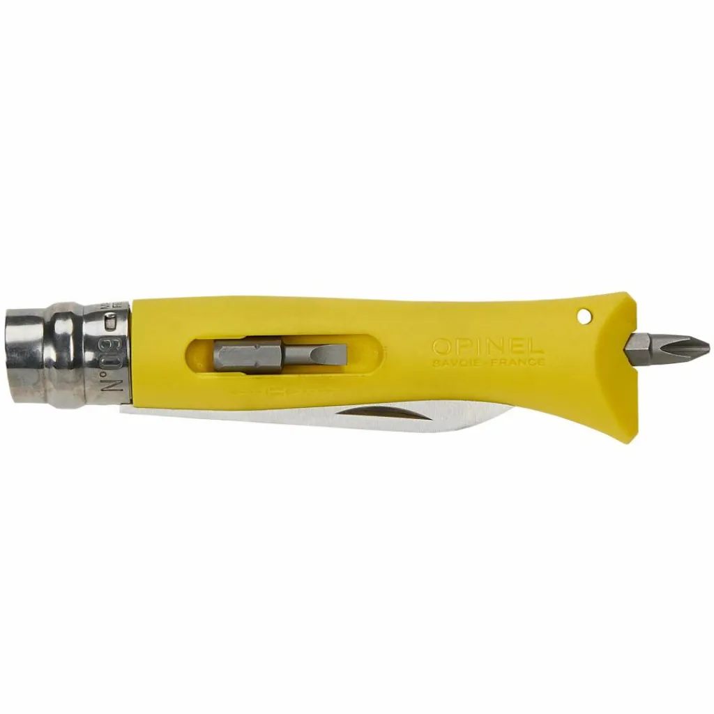 Das DIY Taschenmesser von Opinel sollte in keinem Werkzeugkoffer oder Handschuhfach fehlen. Es hilft dir bei kleineren Reparaturen an elektrischen Bauteilen oder beim Zusammenschrauben von Bauteilen. Die Bithalter in der Griffschale nehmen dafür zwei Standard-Bits auf, die zum Arbeiten am Griffende in den Biteinsatz gesteckt werden können. Die beiliegenden Schlitz- und Kreuz-Bits kannst du individuell für deine Arbeiten austauschen.