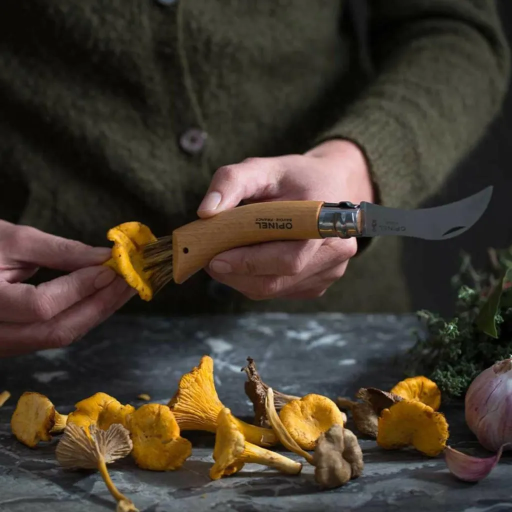 Das robuste Pilzmesser von Opinel überzeug mit seiner hakenförmiger Klinge aus Edelstahl und der Bürste aus Wildscheinborsten am Griffende. Damit geht es den Pilzen an den Kragen.