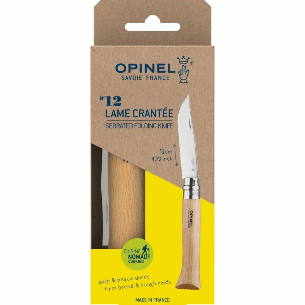 Das gezahnte Taschenmesser nimmt im Gepäck wenig Platz ein, entpuppt sich aufgeklappt jedoch zu einem vollwertigen Messer. Die Klinge besteht aus rostfreiem Edelstahl der Sorte 12C27M und zerteilt mühelos selbst große Früchte und Gemüse. Der lackierte Griff aus französischem Buchenholz ist Opinel-typisch mit der Virobloc-Sicherung ausgestattet, die ein Auf- und Zuklappen beim Transport oder der Benutzung verhindert.