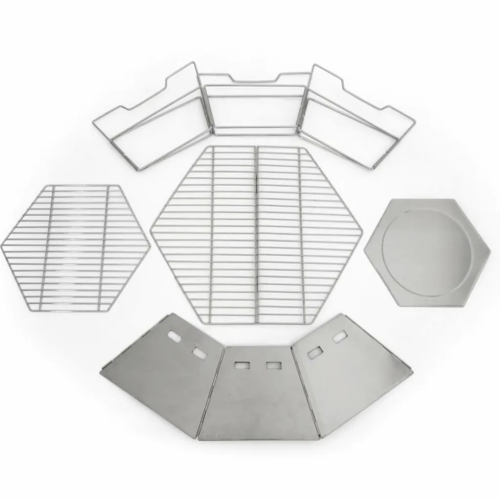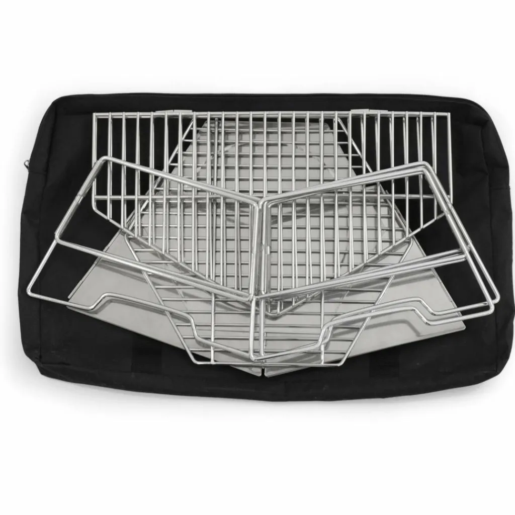 Für einen sicheren Stand sorgen die Edelstahlfüße. Sie umfassen die Feuerschale und verhindern, dass die zusammengesteckten Bleche ihren Halt verlieren. Der eingesetzte Rost lässt genügend Sauerstoff an Feuer und Kohle, damit ausreichend Hitze entstehen kann. Zum Transport kannst du alle Teile flach und platzsparend im Packbeutel verstauen.