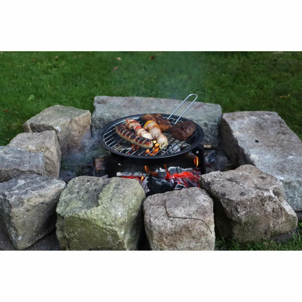 Grill aus beschichtetem Carbonstahl und mit verchromtem Grillrost. Durch herausnehmbare Einsätze auch über offenem Feuer und als Feuerschale verwendbar.