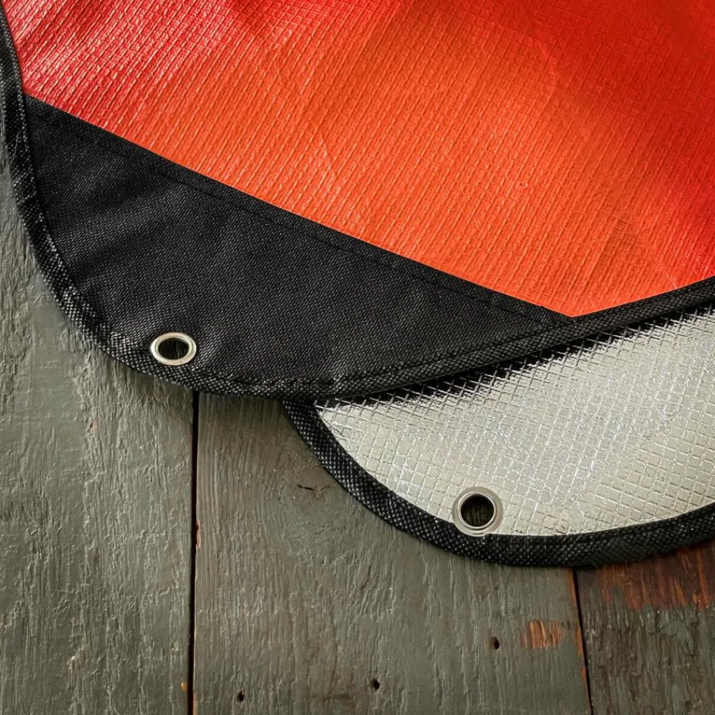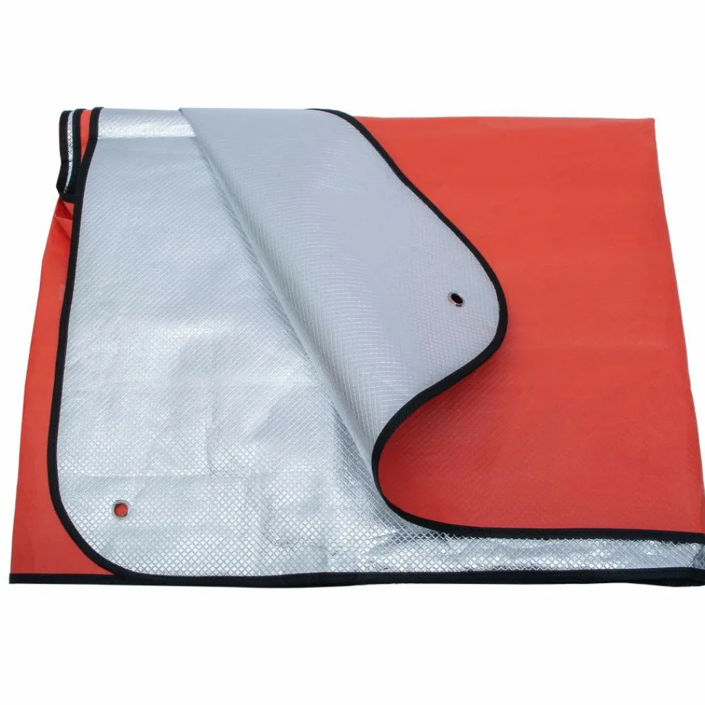Rettungsdecke aus Verbundmaterial. Die hochwertige Alubeschichtung erreicht eine 90 %ige Wärmerückstrahlung. An den Kanten ist die Unterlage eingesäumt, die Ecken sind verstärkt und mit Ösen versehen.