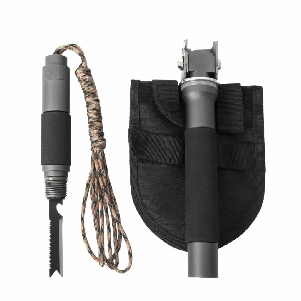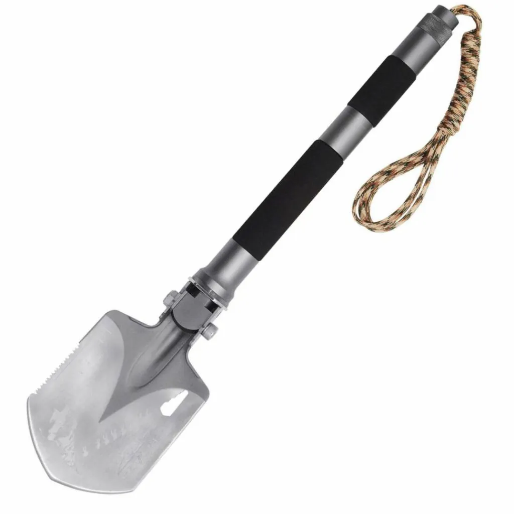 Klappschaufel aus Edelstahl, mit der du nicht nur den Spatengang verrichten kannst. Ausgestattet mit einer Hack- und Sägefunktion und praktischen Helfern, wie Schraubenschlüssel und Notfallpfeife.