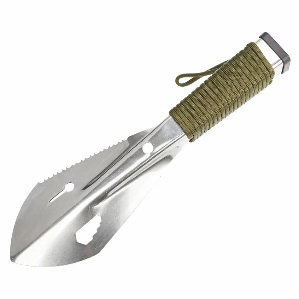 Neben der Aufgabe als Schaufel kann sie auch als Säge, Messer, Schraubenschlüssel, Nagelzieher und Lineal verwendet werden. Außerdem ist der Griff mit einer 3 m langen Paracord-Schnur umwickelt.