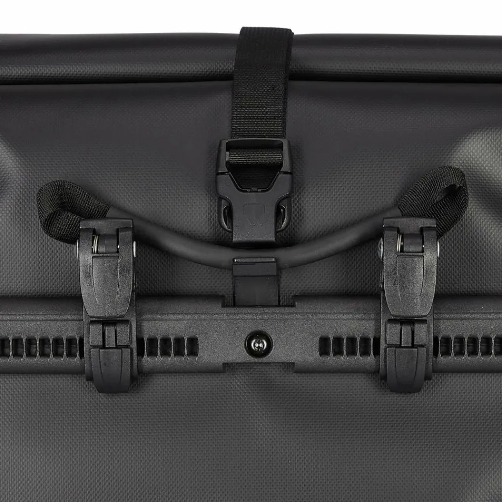 Aufhängung für Gepäckträger mit einem Rohrdurchmesser von 8 bis 16 mm. Beim QL2.1-System wurde die Schiene mit den Befestigungshaken an der Taschenrückseite überarbeitet. Die beiden oberen Haken lassen sich werkzeugfrei auf der nun aus einem Stück gefertigten Schiene verschieben und durch Anheben des Tragegriffs öffnen. Der untere Arretierungshaken ist ebenfalls auf einer halbelliptischen Schiene individuell anpassbar und werkzeugfrei in 15°-Schritten drehbar. Ein Scheuerschutz im unteren Bereich der Taschen und an der Auflagefläche des Gepäckträgers beugt Abrieb vor.