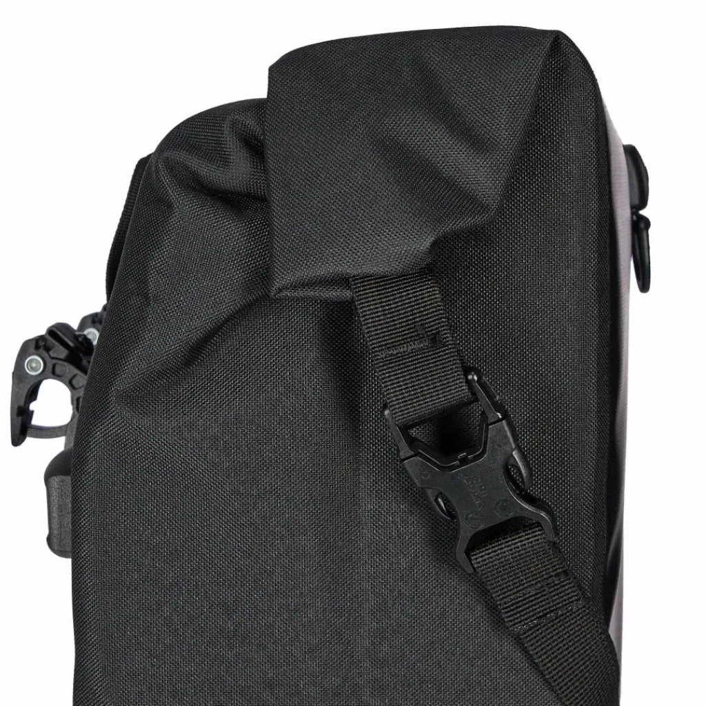 Aufhängung für Gepäckträger mit einem Rohrdurchmesser von 8 bis 16 mm. Die beiden oberen Haken lassen sich werkzeugfrei auf der aus einem Stück gefertigten Schiene verschieben und durch Anheben des Tragegriffs öffnen. Der untere Arretierungshaken auf einer halbelliptischen Schiene ist ebenfalls individuell anpassbar und werkzeugfrei in 15-Grad-Schritten drehbar. Ein Scheuerschutz im unteren Bereich der Taschen und an der Auflagefläche des Gepäckträgers beugt Abrieb vor.