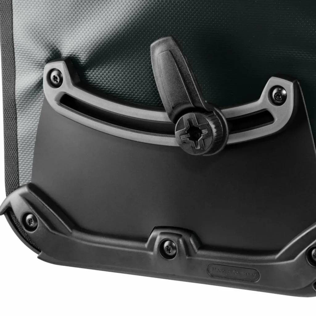 Aufhängung für Gepäckträger mit einem Rohrdurchmesser von 8 bis 16 mm. Beim QL2.1-System wurde die Schiene mit den Befestigungshaken an der Taschenrückseite überarbeitet. Die beiden oberen Haken lassen sich werkzeugfrei auf der nun aus einem Stück gefertigten Schiene verschieben und durch Anheben des Tragegriffs öffnen. Der untere Arretierungshaken ist ebenfalls auf einer halbelliptischen Schiene individuell anpassbar und werkzeugfrei in 15°-Schritten drehbar. Ein Scheuerschutz im unteren Bereich der Taschen und an der Auflagefläche des Gepäckträgers beugt Abrieb vor.