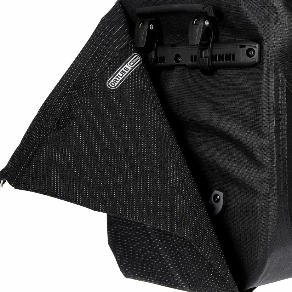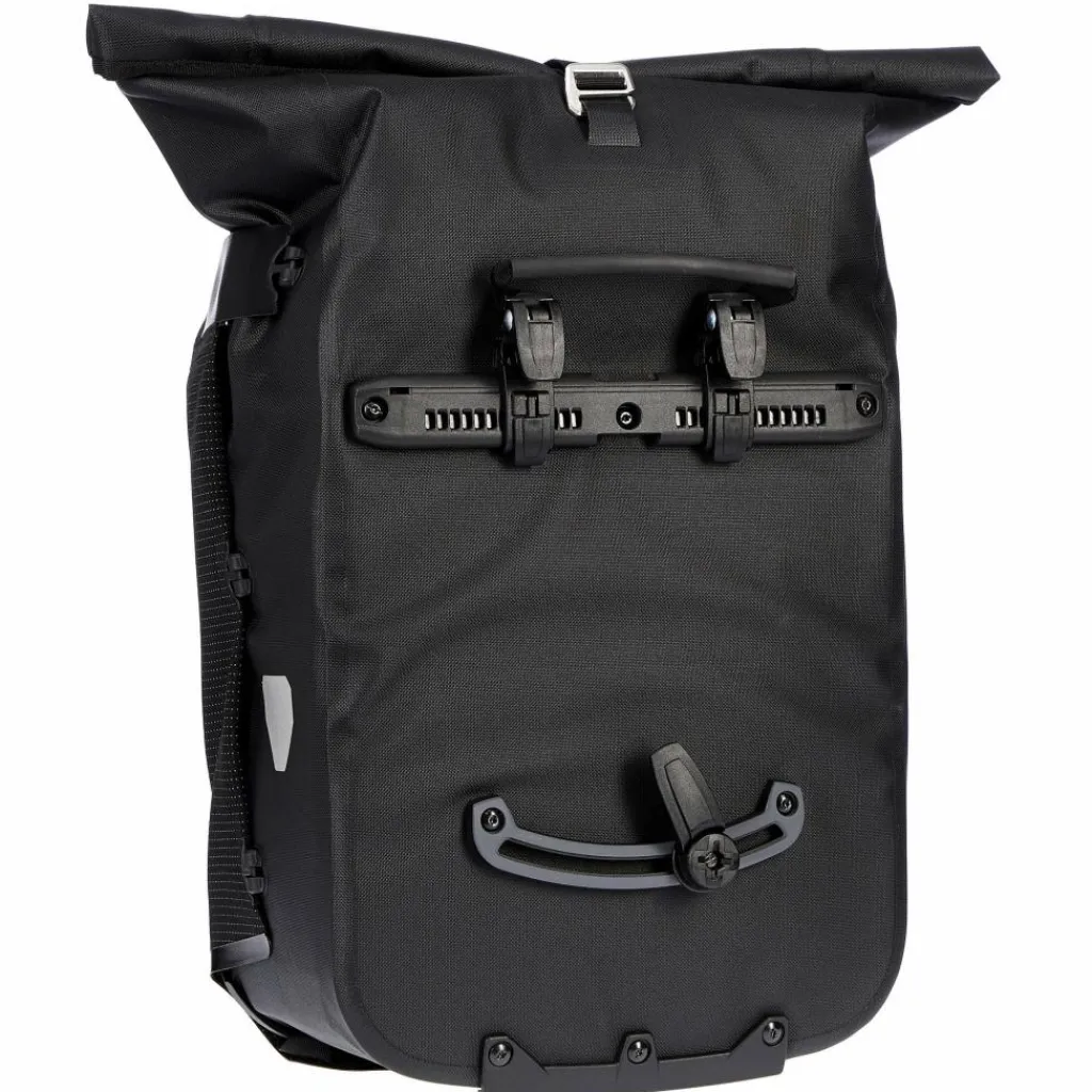 Aufhängung für Gepäckträger mit einem Rohrdurchmesser von 8 bis 16 mm. Die beiden oberen Haken lassen sich werkzeugfrei auf der aus einem Stück gefertigten Schiene verschieben und durch Anheben des Tragegriffs öffnen. Der untere Arretierungshaken ist ebenfalls auf einer halbelliptischen Schiene individuell anpassbar und werkzeugfrei in 15-Grad-Schritten drehbar. Ein Scheuerschutz im unteren Bereich der Taschen und an der Auflagefläche des Gepäckträgers beugt Abrieb vor.Details