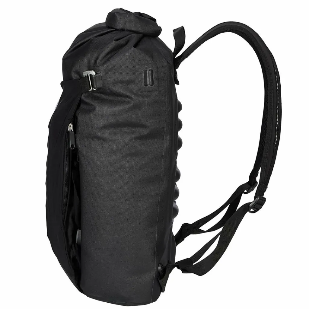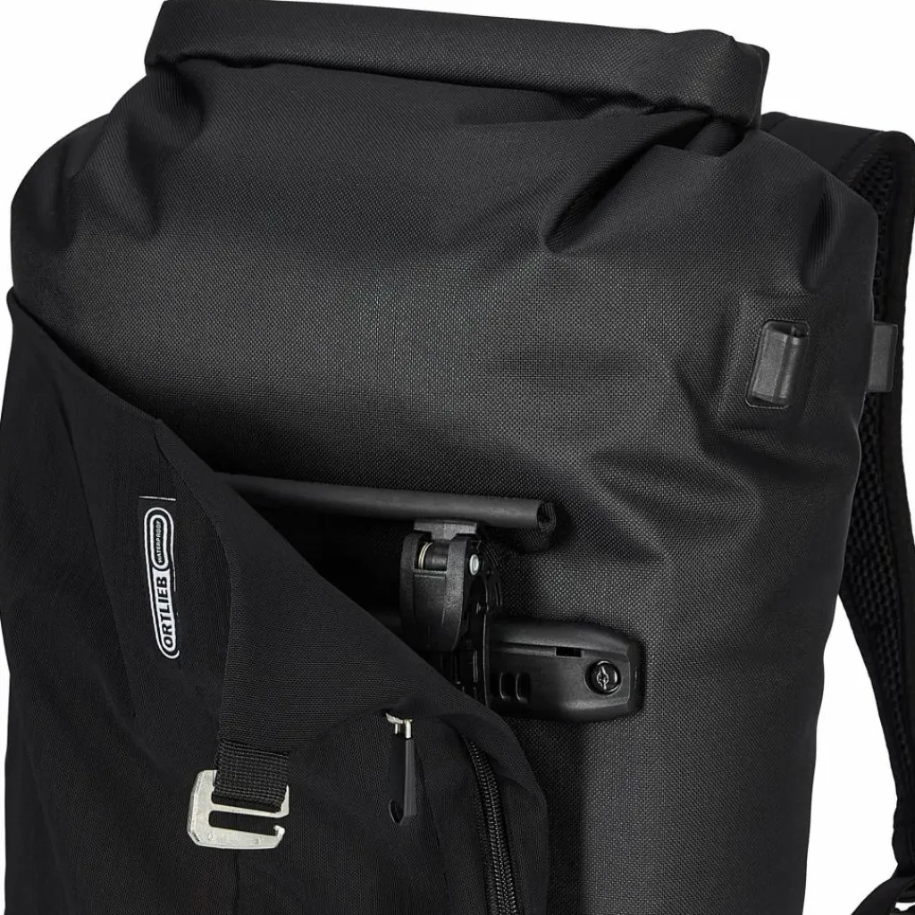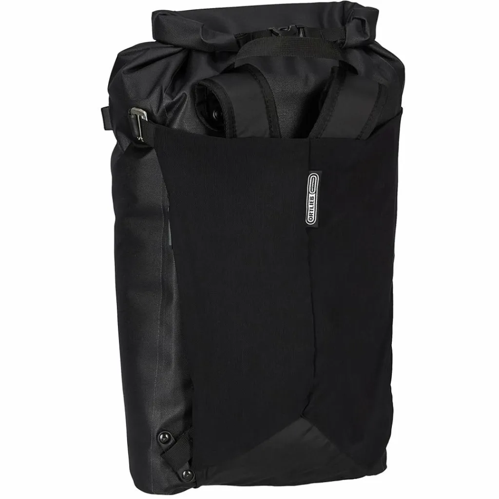 Der flexible Deckel ist mittig an der Seite und am Boden der Vario Lite beweglich angeschlagen. Entweder deckt das Flap also das QuickLock 2.1 System ab, oder aber die Tragegurte. Der Clou: Du kannst es von der einen Seite auf die andere Seite in Sekunden umklappen und fixieren. Fertig ist die Fahrradtasche, respektive der Rucksack! Einfacher kann man samt Tasche gar nicht vom Drahtesel auf Schusters Rappen wechseln. Das Flap schützt jeweils die abgedeckte Seite. Und es bewahrt dich vorm Schmutz, der eventuell vom Hinterrad an deine Packtasche geschleudert wurde.