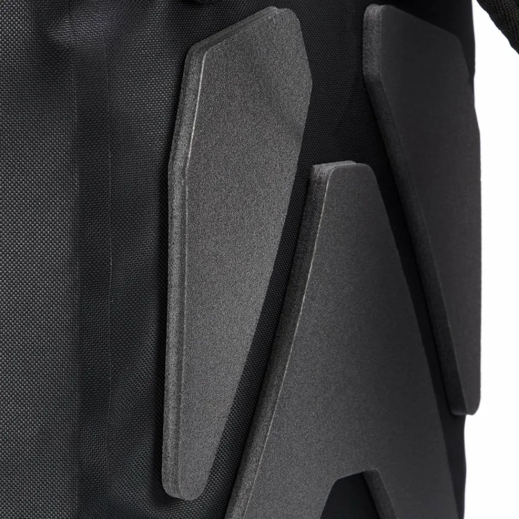 Das gepolsterte Laptopfach ist schwebend angebracht. So stößt der Laptop beim Absetzen des Rucksacks nicht auf dem Boden auf. Zwei Standfüße schützen die Unterkante des Velocity PS 23L und geben ihm Standsicherheit. Der Fahrradrucksack ist wasserdicht, aber wie immer gilt: Um die Wasserdichtigkeit zu gewährleisten, muss der Verschluss 3x gerollt werden!