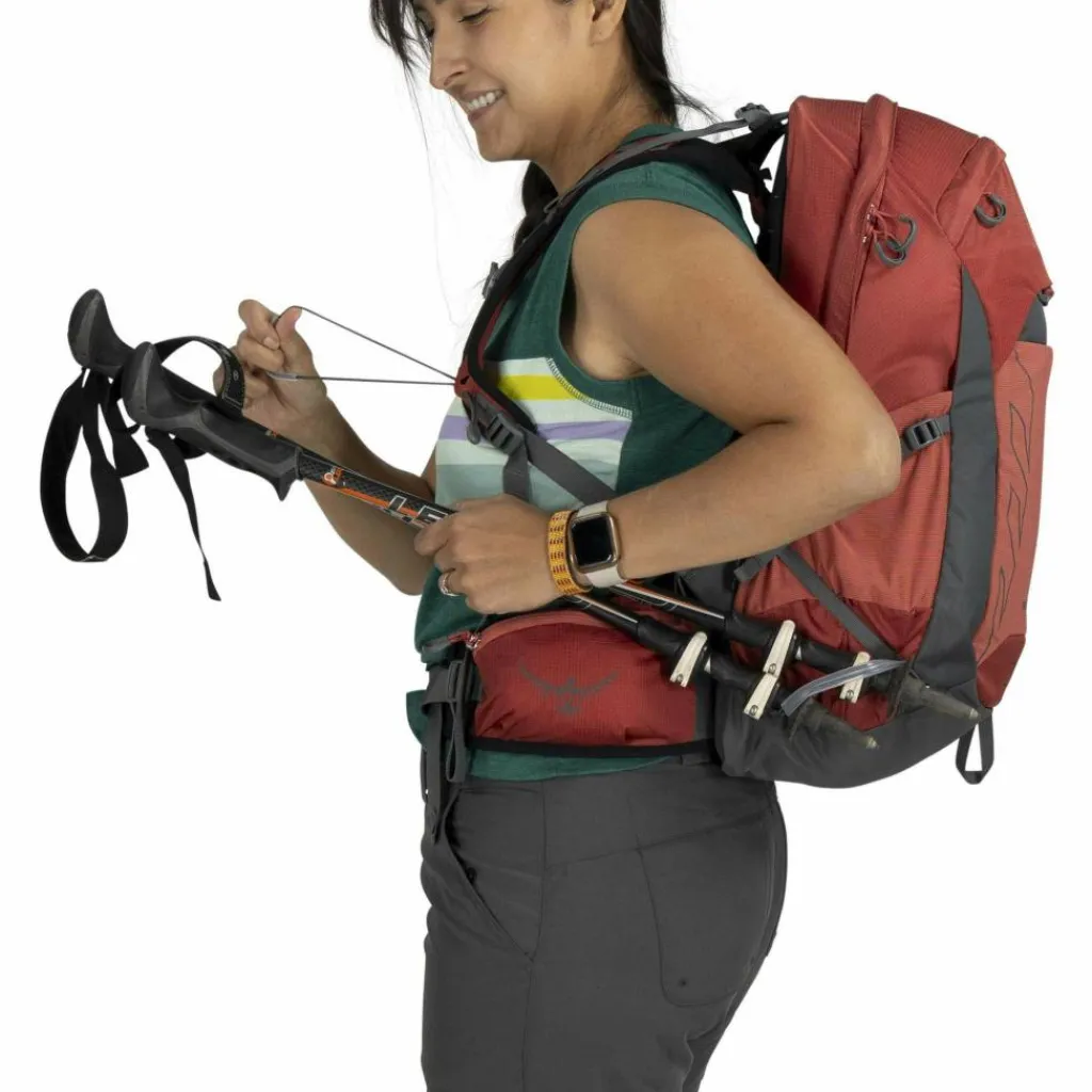 Besonders praktisch ist auch Ospreys Stow-on-the-Go Trekkingstockhalterung, mit der du deine Stöcke auch mit geschultertem Rucksack bequem erreichst. Und für alle, die auch gern auf zwei Rädern unterwegs sind, ist der Tempest mit einer LidLock-Helmhalterung ausgestattet.